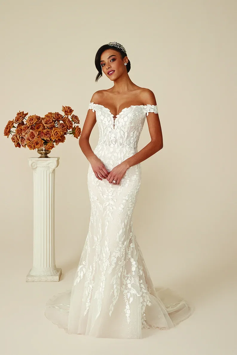 Jurk Deidra van Justin Alexander is een romantische off-shoulder bruidsjurk met bladvormige applicaties en heeft hetzelfde silhouet als de bruidsjurk van Britney, sans split. Jurk Denley van Justin Alexander heeft een zorgvuldig geplooid lijfje en een flatterende gestikte halslijn die matchen met Britney’s jurk, maar een volumieuze rok inclusief zakken. Handig!