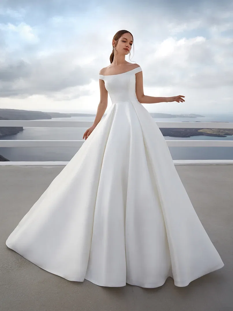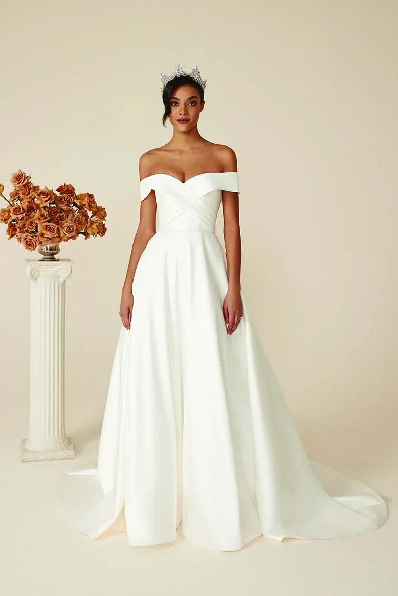 Minimalistisch en romantisch – jurk Calliope van Nicole Milano combineert het beste van beide werelden! Het halternek-lijfje met gedrapeerde details voegen, samen met de speelse split, een sexy noot toe aan deze moderne bruidsjurk. Jurk Martinica van Nicole Milano straalt in al haar eenvoud. De top met baleinen en off-shoulder mouwen doet denken aan de jurk van Britney, maar de volumineuze rok maakt van geeft dit design een prinsessenlook.