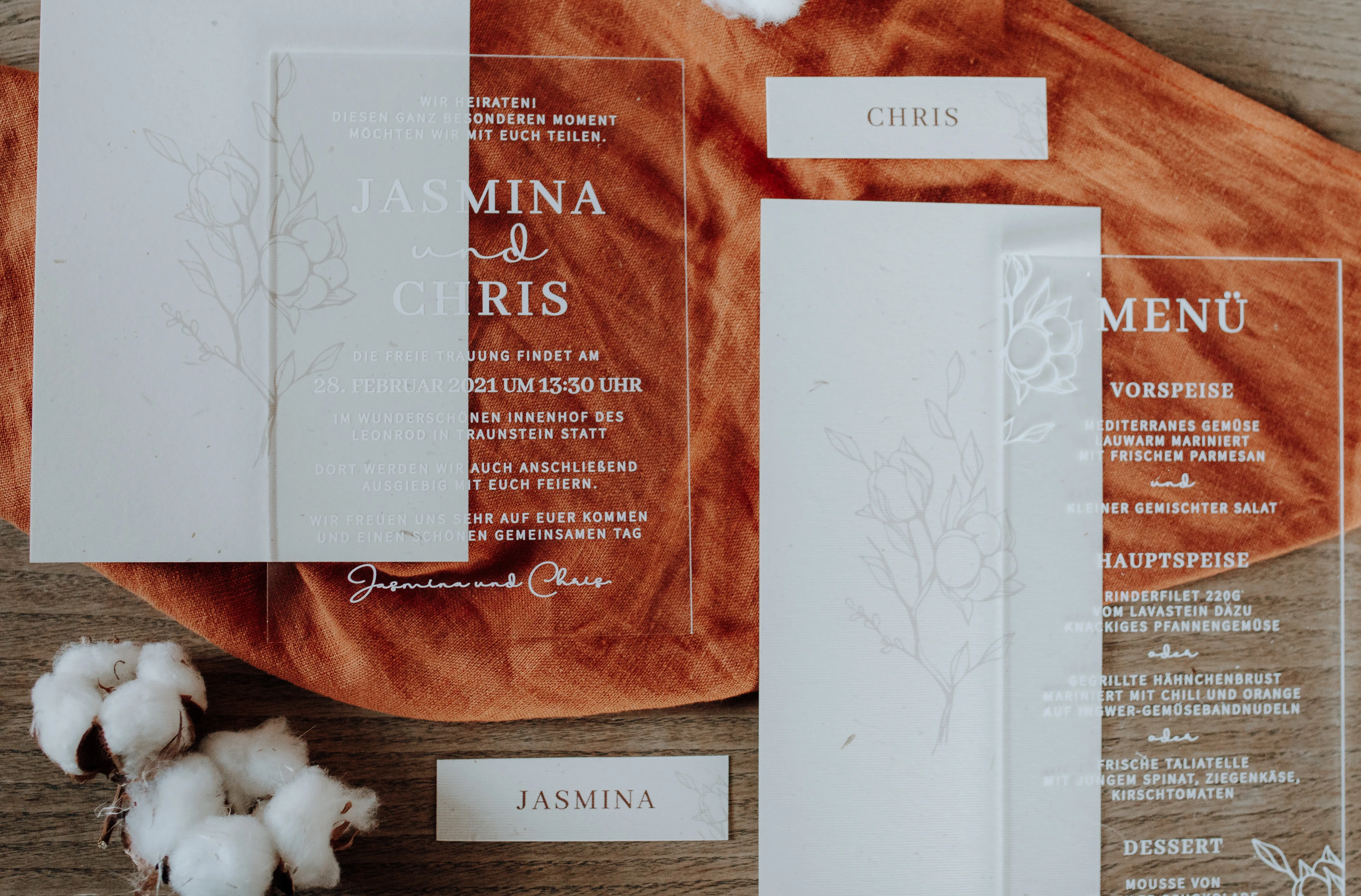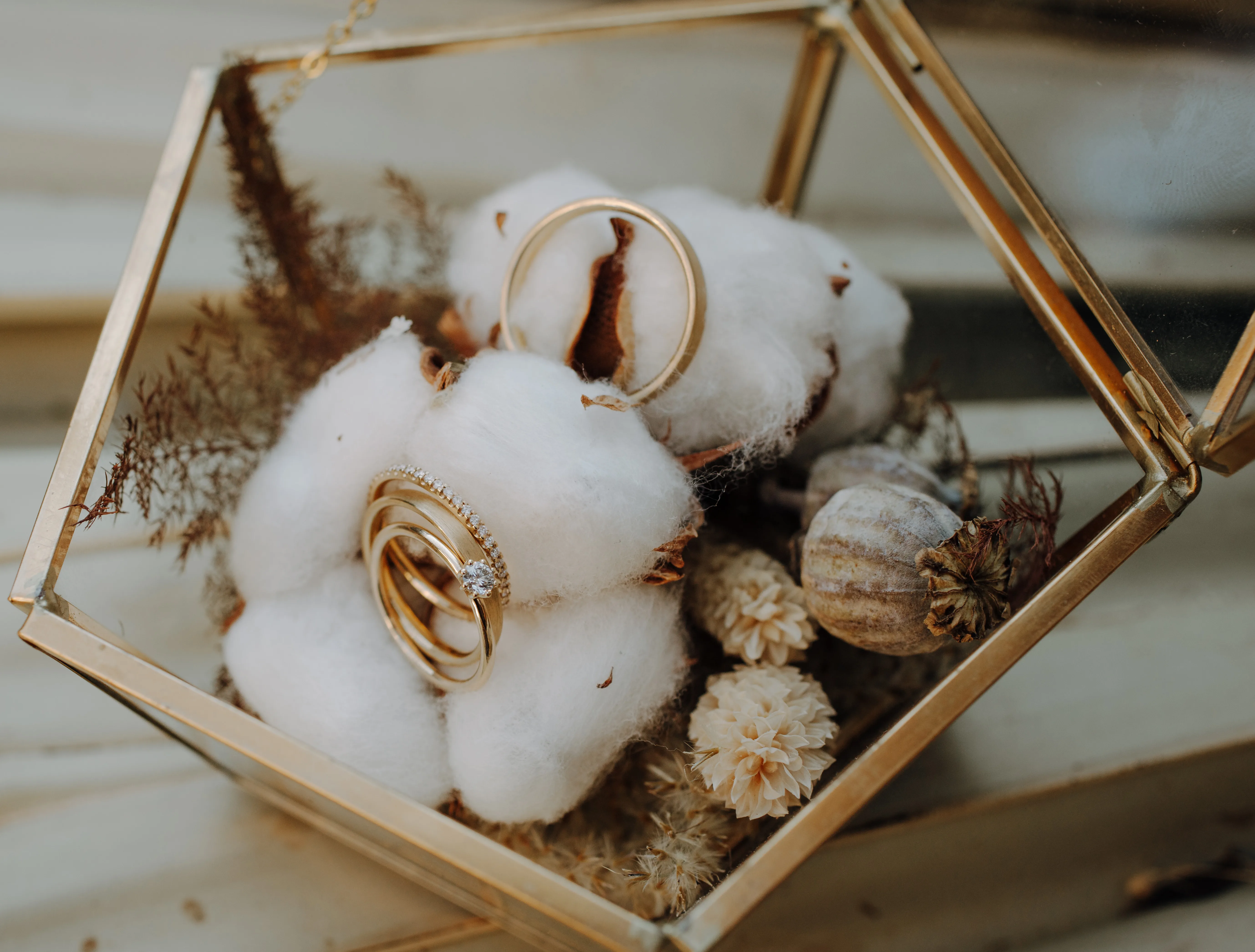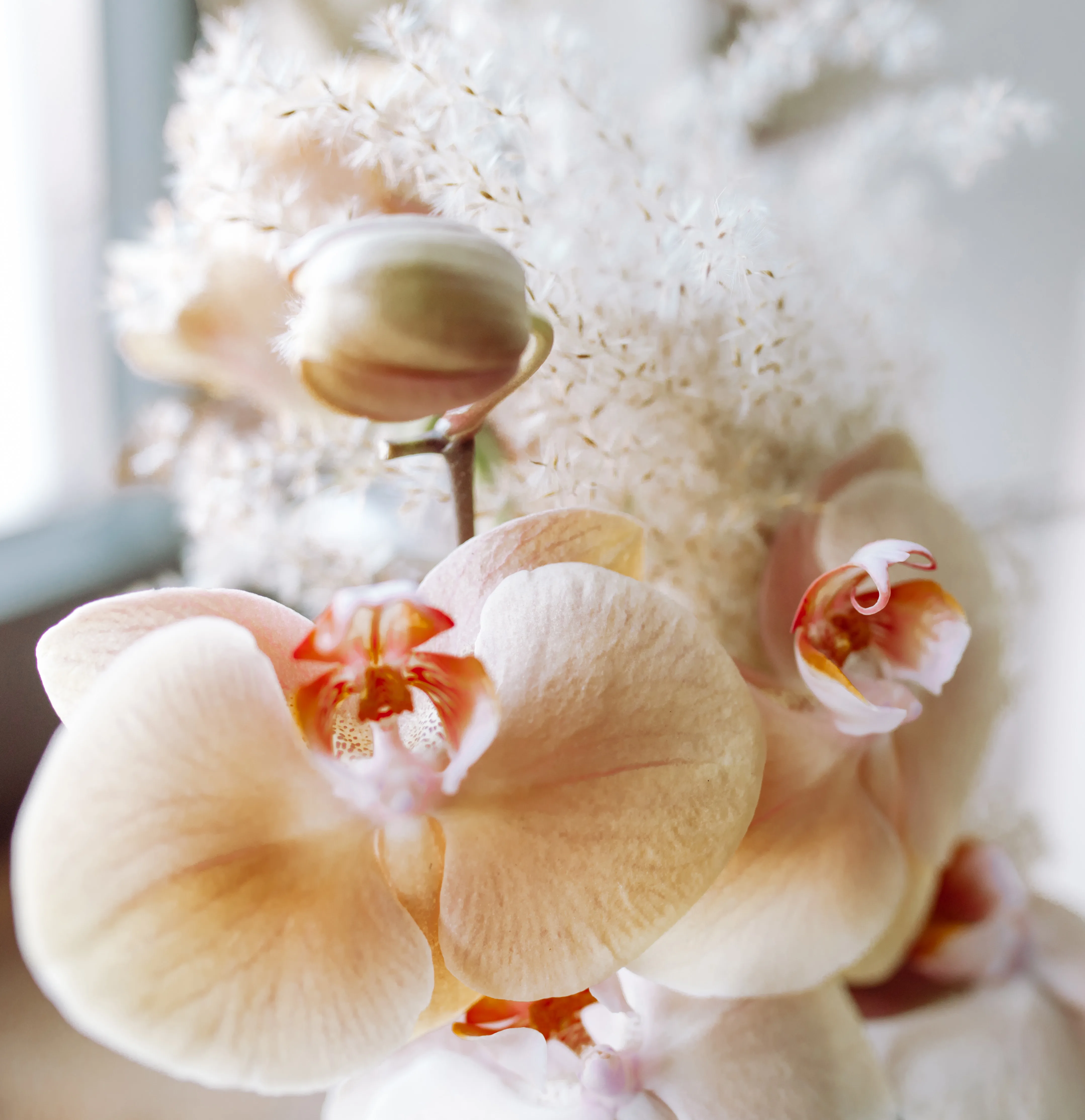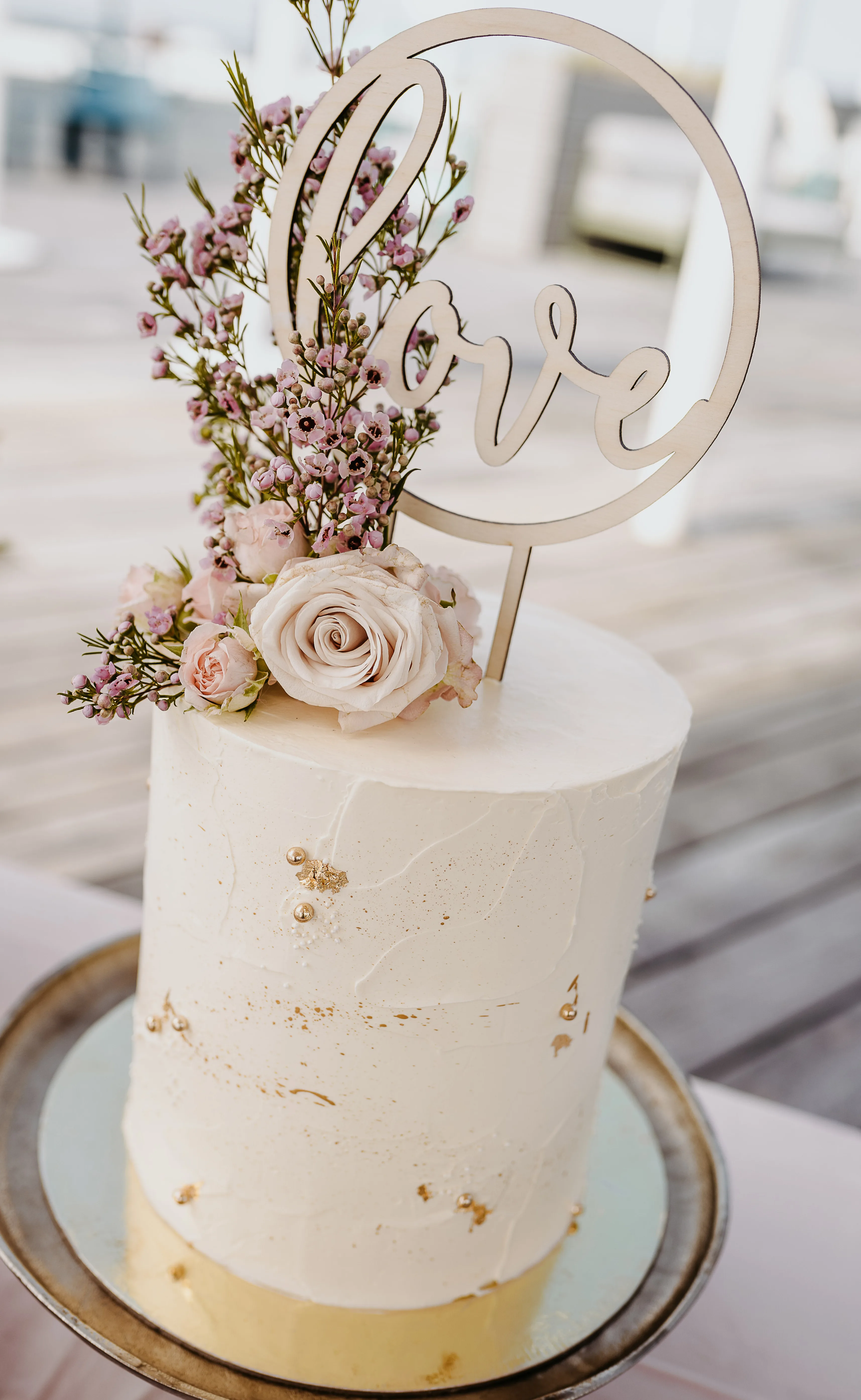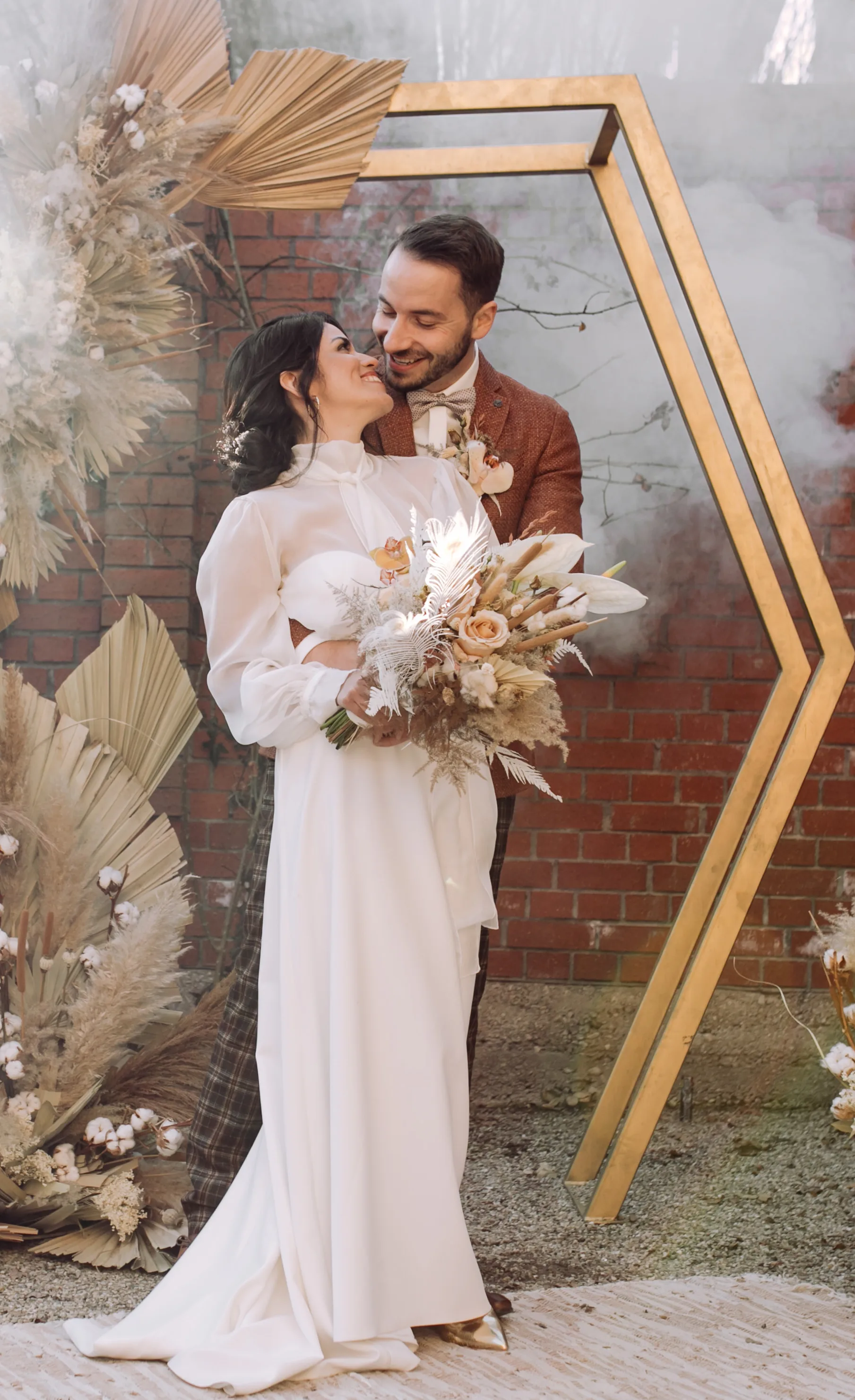 Dit dromerige vintage boho-concept is geïnspireerd op een fluffy, wit-gekleurde suikerspin, wat wordt weerspiegeld door het lichte en luchtige karakter van de decoratie. Niet-eetbare decoratie-alternatieven zijn donzige katoenbloesems, die vooral worden gecombineerd met pampasgras en palmbladeren.