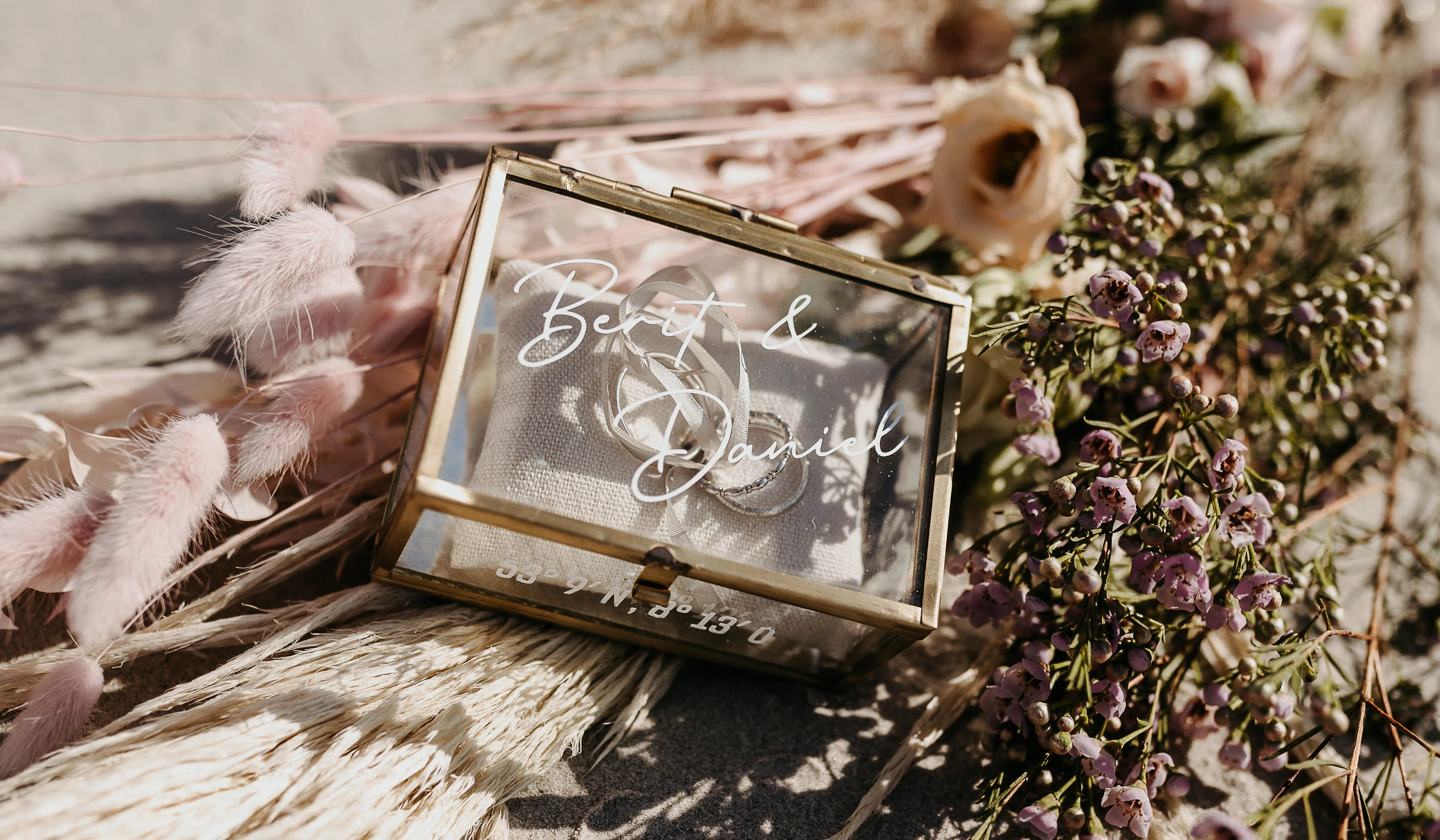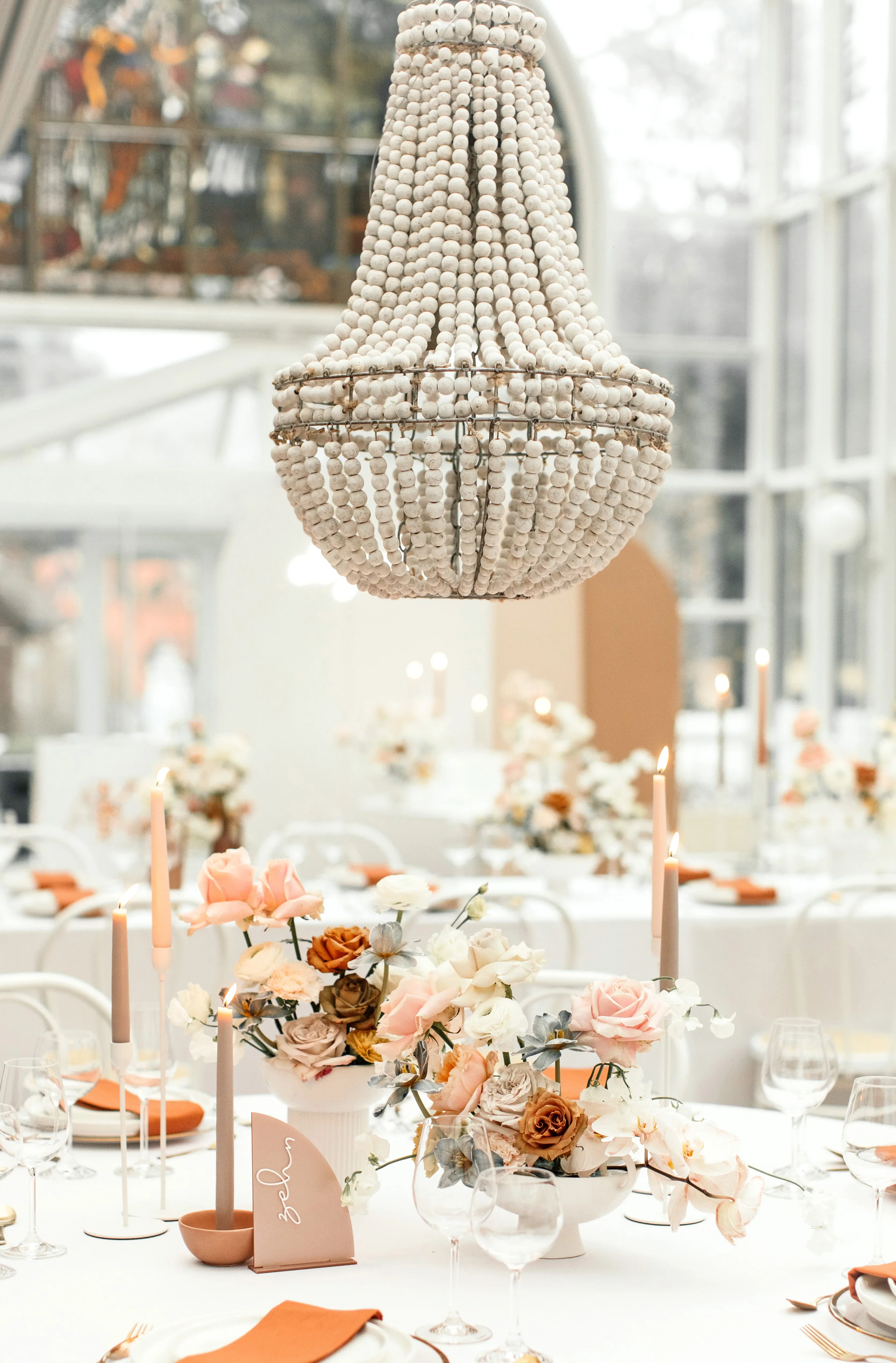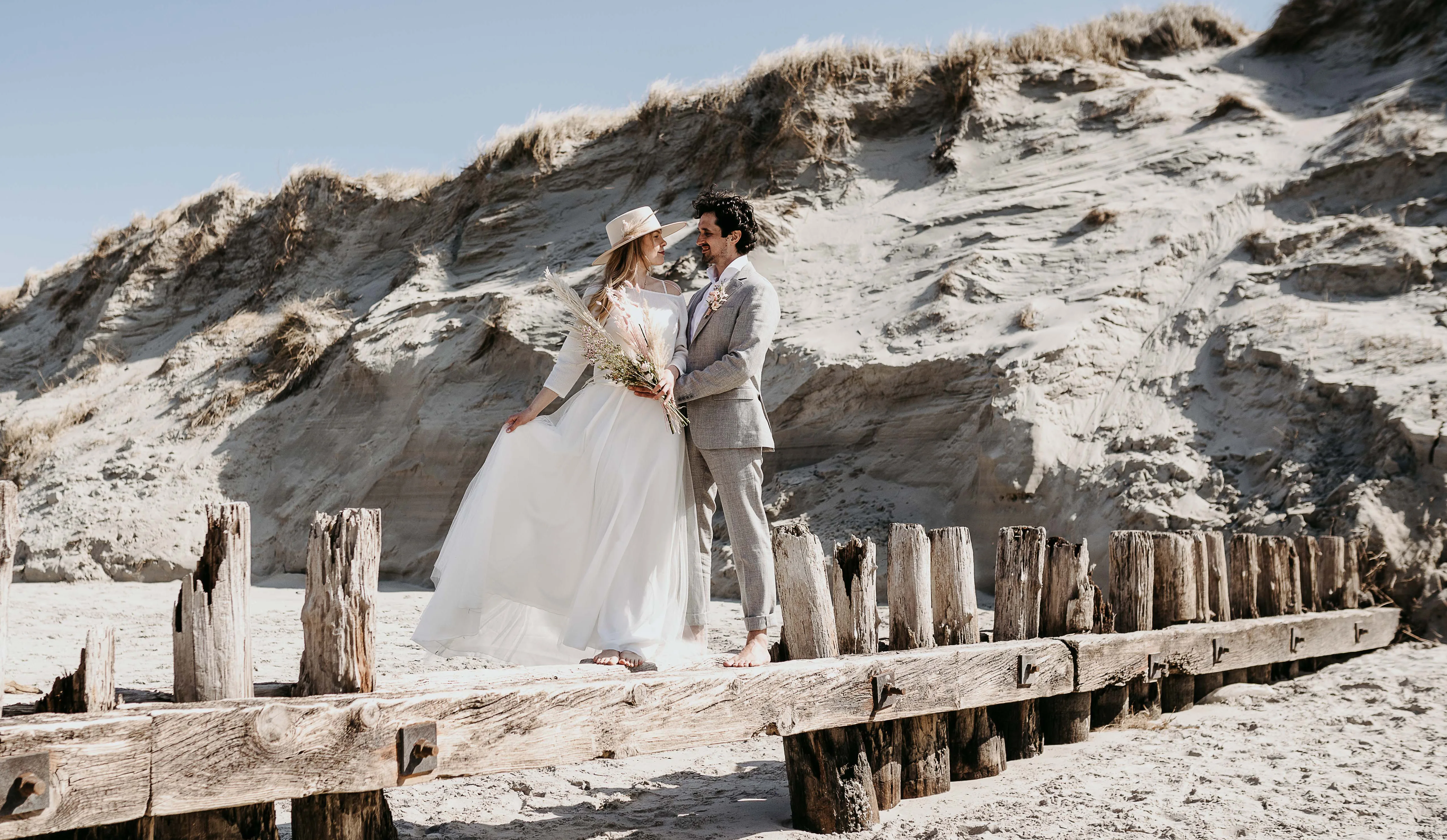 De uitgelichte kleur van dit beachy boho-concept is een zoet suikerspinroze dat zowel in de snoepjes als in de gedroogde en verse bloemstukken terug te vinden is. Details van hout en rotan in zand, beige en wit zorgen voor een harmonieus evenwicht.
