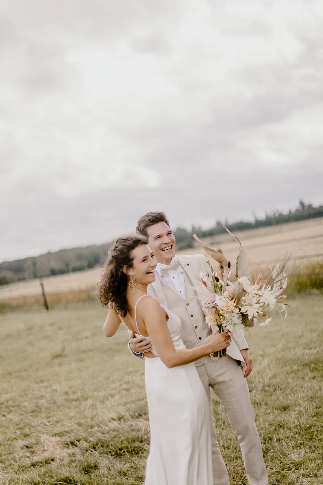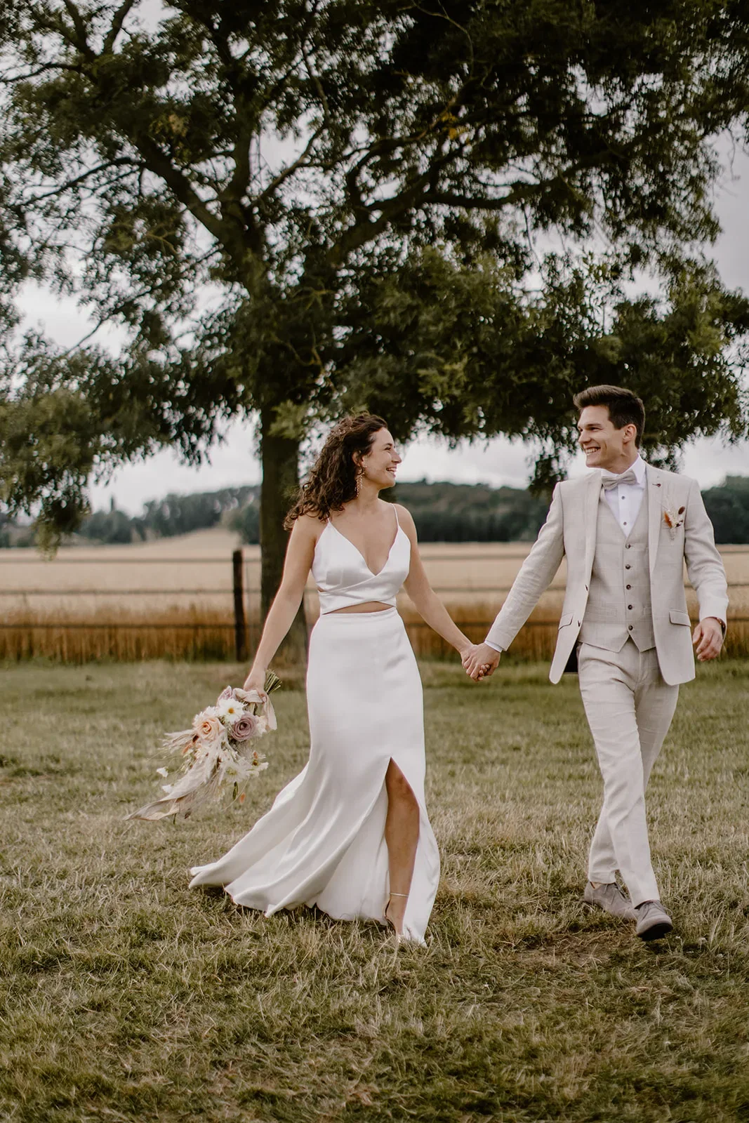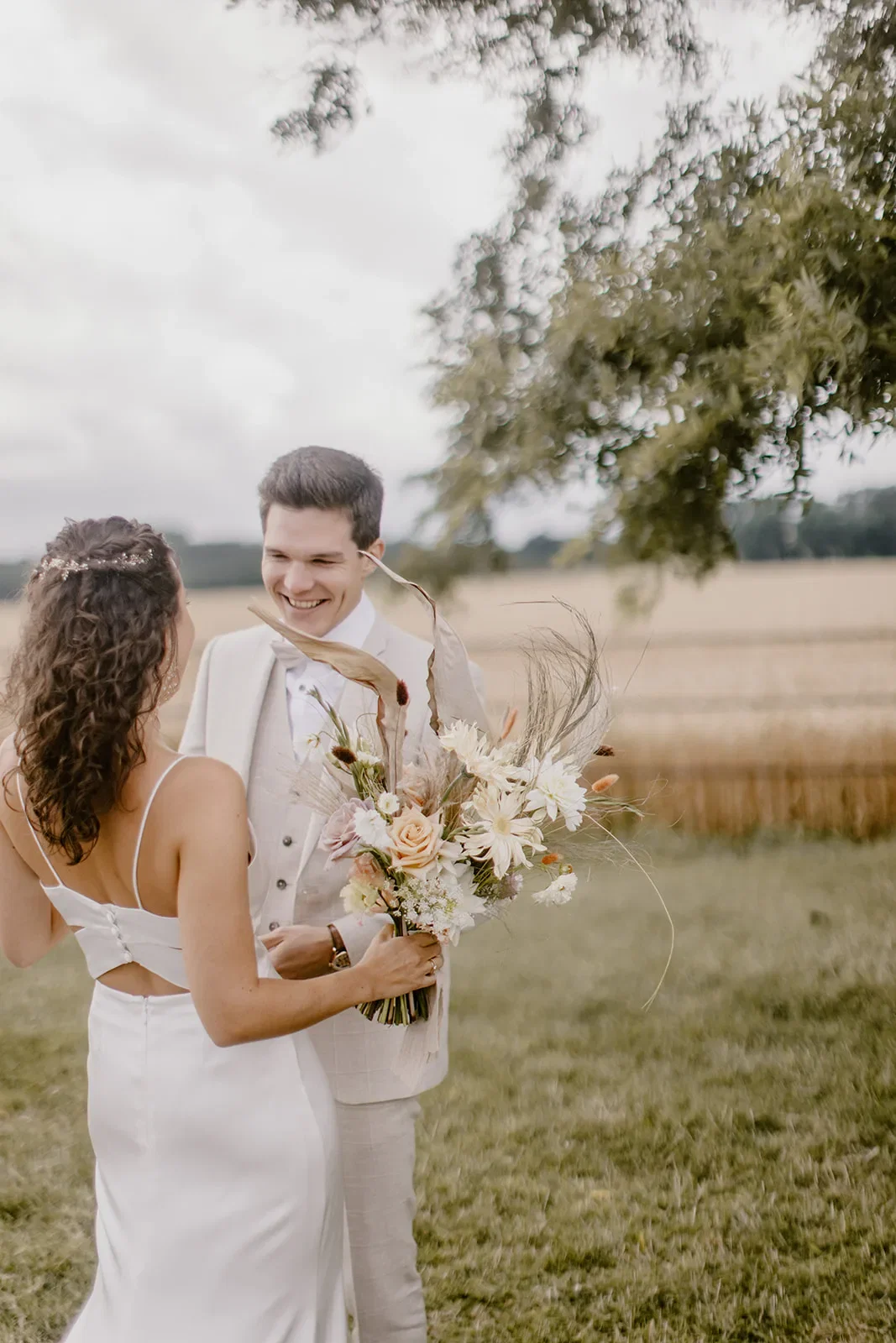 Toen zowel Rikke als Sebastian klaar waren, was het tijd voor de first look. “Via mijn werk hadden we een prachtig gerenoveerd oldtimer geregeld. Samen met zijn vader is Sebastian mij komen ophalen bij mijn ouders. Daar hebben we in de paardenweide met de gezinnen en getuigen de first look gedaan.”