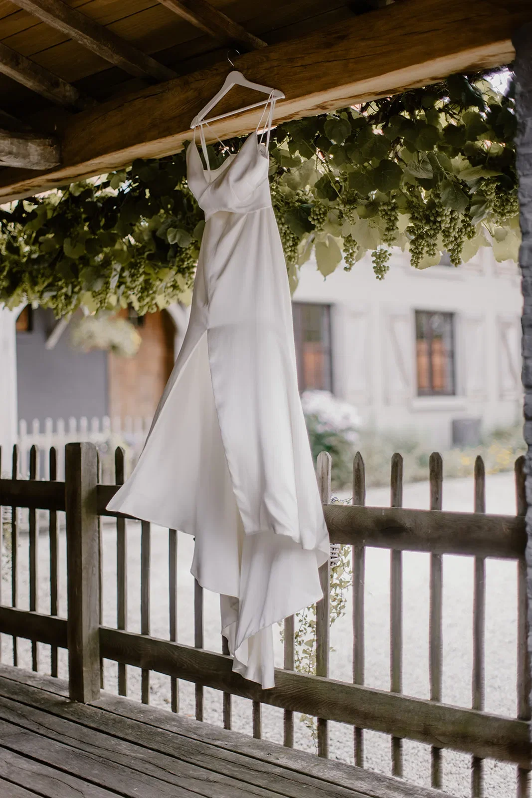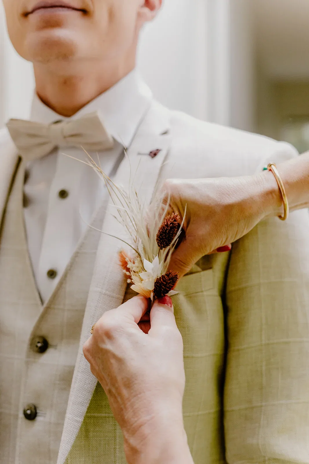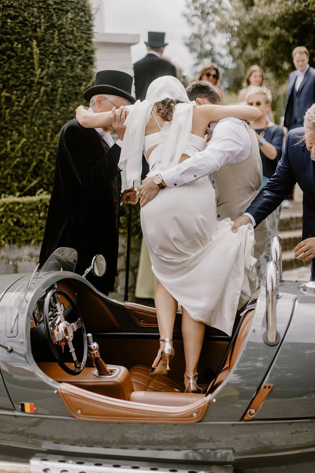Toen zowel Rikke als Sebastian klaar waren, was het tijd voor de first look. “Via mijn werk hadden we een prachtig gerenoveerd oldtimer geregeld. Samen met zijn vader is Sebastian mij komen ophalen bij mijn ouders. Daar hebben we in de paardenweide met de gezinnen en getuigen de first look gedaan.”