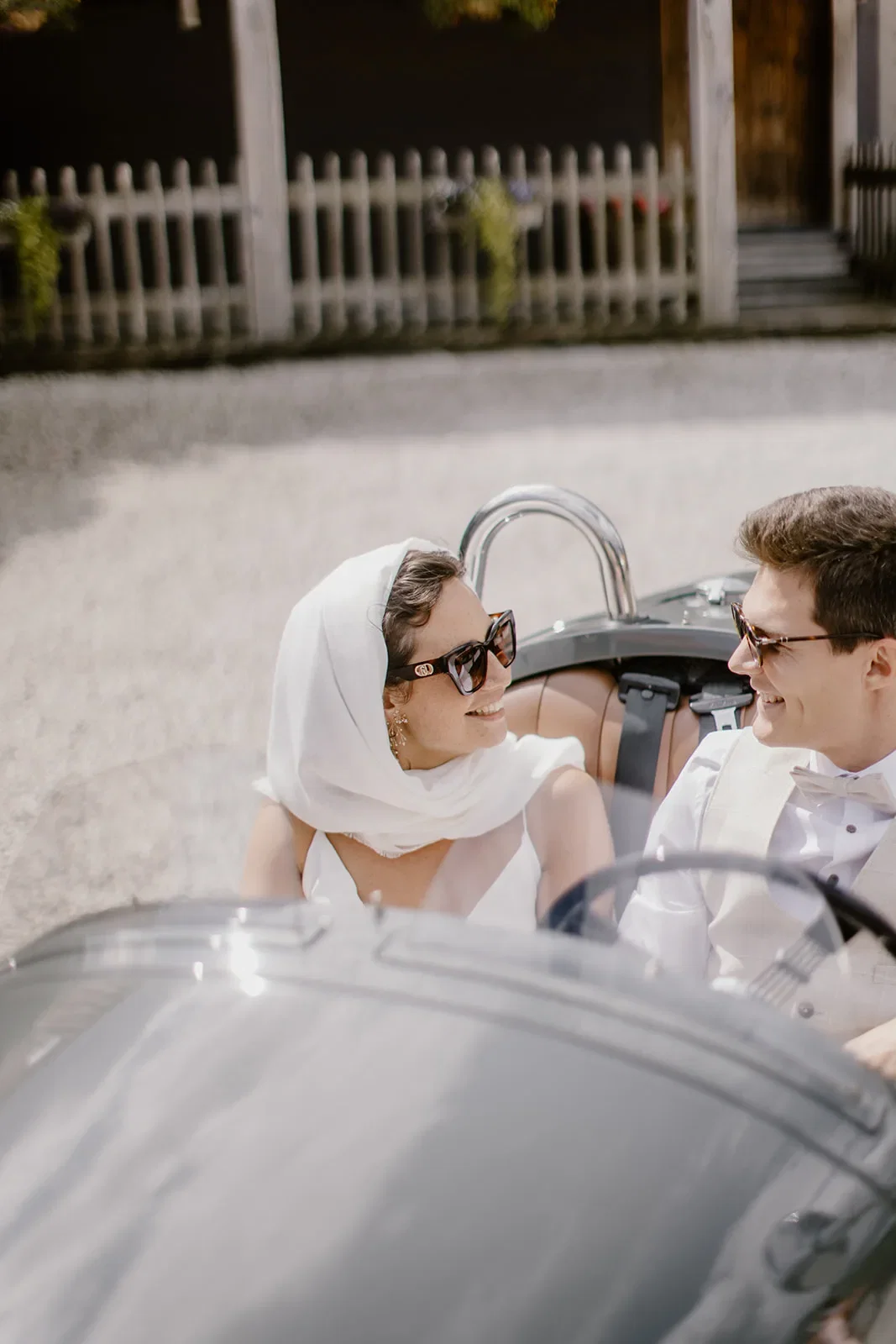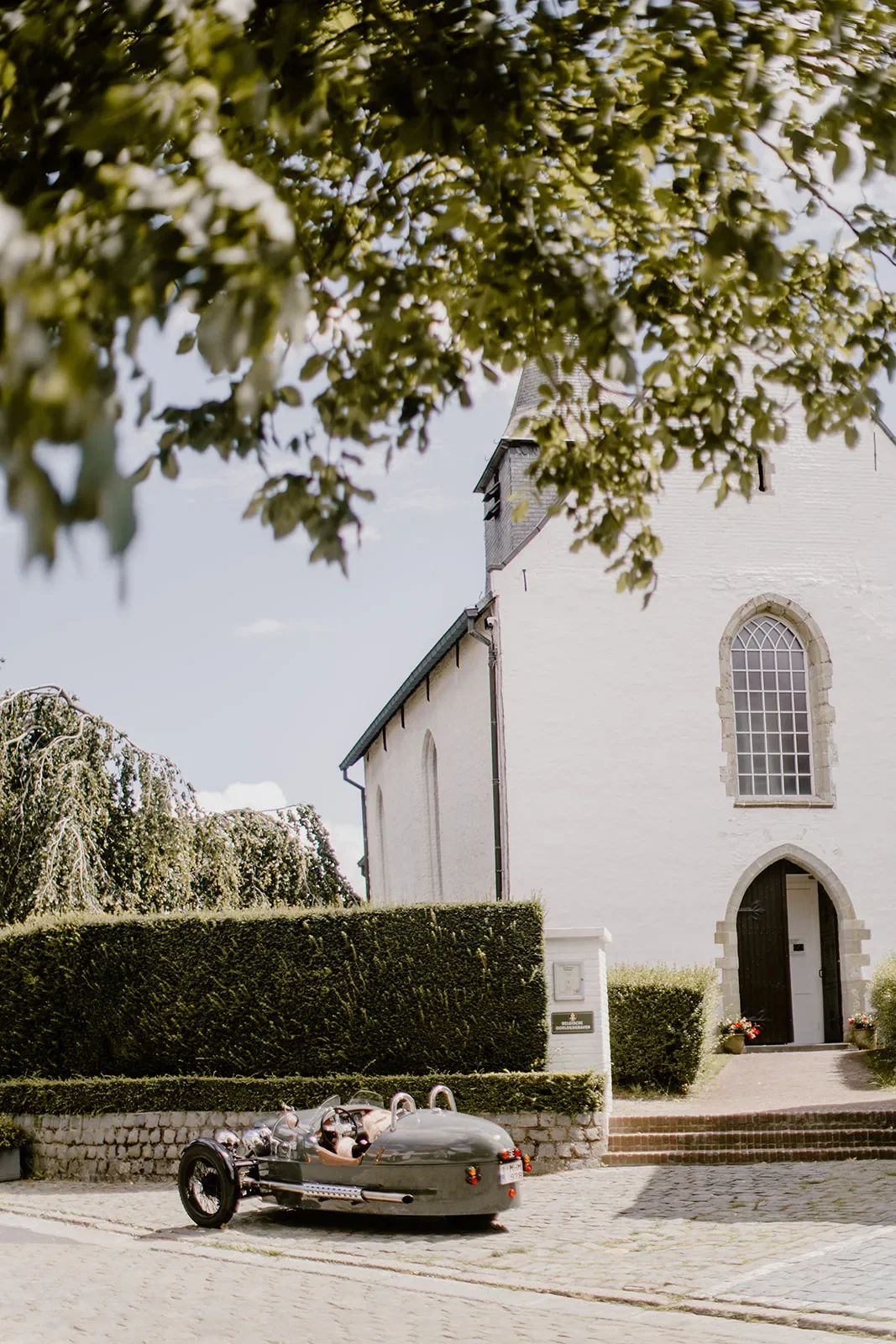 “Na de first look gingen we foto’s trekken bij mijn ouderlijk huis en vervolgens met z’n tweetjes in de oldtimer naar de kerk gereden. Die rit van 15 minuten was zó fijn. Gewoon even samen tot rust komen. Toen we eenmaal bij de kerk aankwamen was het eigenlijk de bedoeling dat we ongezien naar binnen zouden lopen, maar onze gasten hadden door dat we er waren en kwamen ons feestelijk onthalen. Achteraf vonden we dat juist erg leuk! Mijn schoonvader had ik nog wel nodig om mij de auto uit te hijsen, vanwege mijn trouwkleed”, lacht Rikke.
