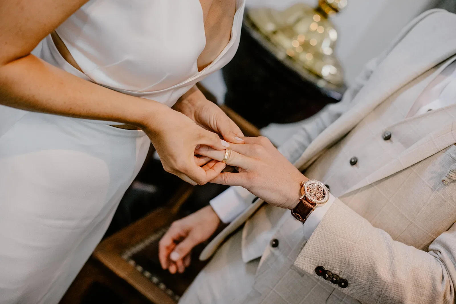 Met fotoshoots bij hun ouderlijke woningen en bijzondere connecties met hun werk, maakten Rikke en Sebastian hun bruiloft zo persoonlijk mogelijk.
