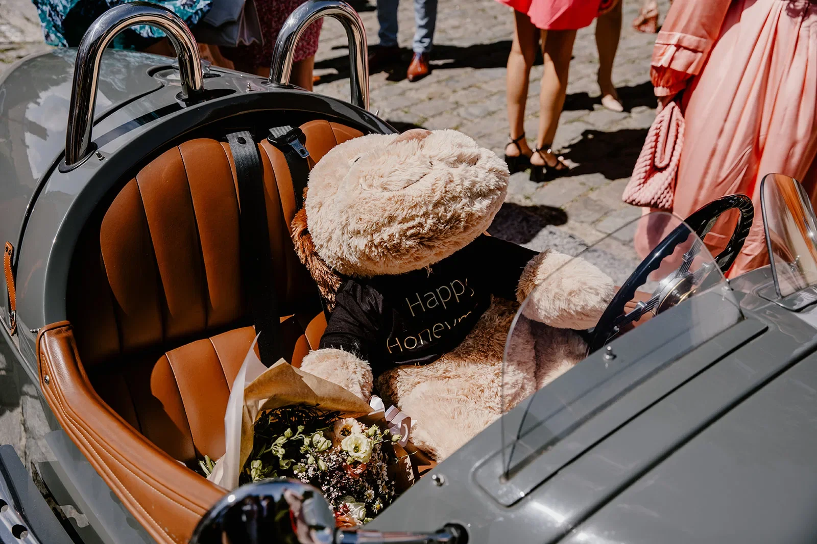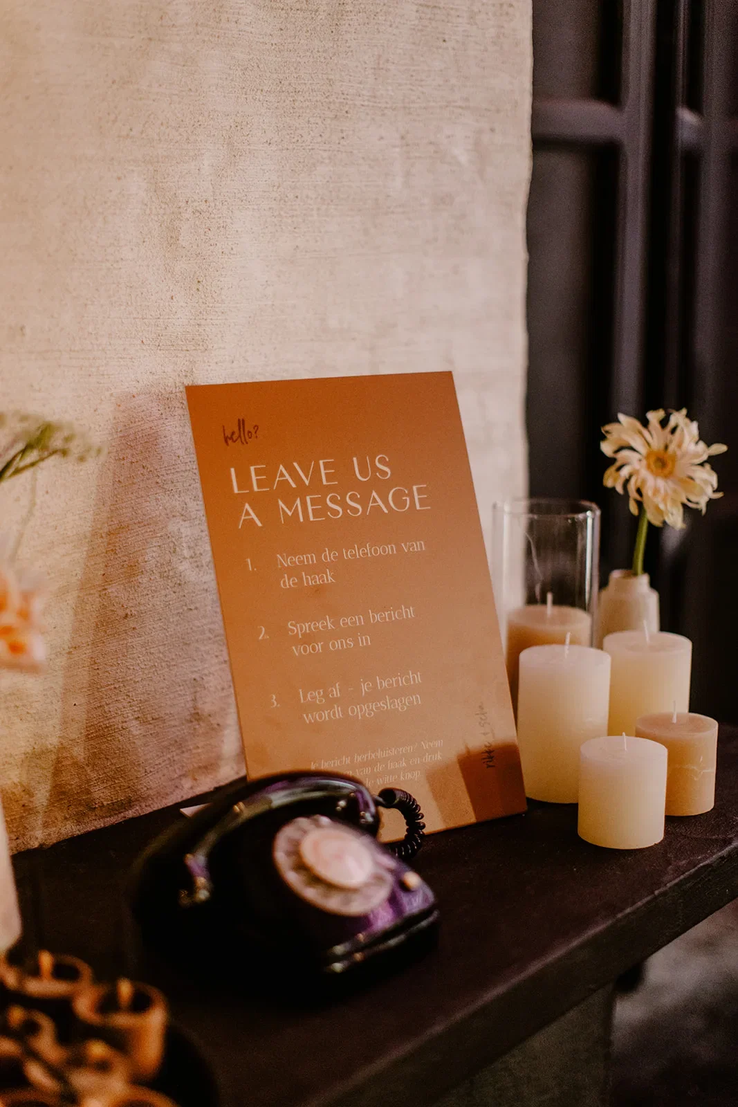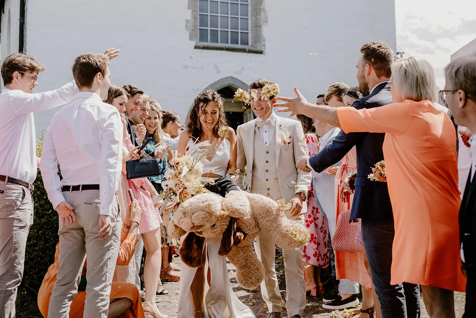 “Toen we de kerk uitliepen stonden onze gasten buiten op ons te wachten om rozenblaadjes te strooien. Hét moment voor de perfecte foto natuurlijk. Raïs, onze fotografe, stond er ook al helemaal klaar voor. Maar zodra we naar buiten stapten, kregen we van één van onze gasten een enorme knuffel in onze handen gedrukt. Het perfecte plaatje dat Raïs voor ogen had, is er dus niet gekomen,” vertelt Rikke. Gelukkig kunnen ze er zelf om lachen en ligt de knuffel al sinds hun bruiloft in de woonkamer.