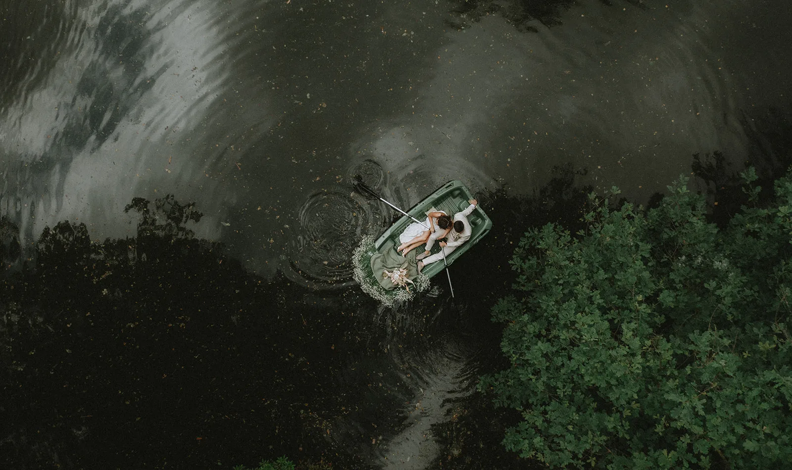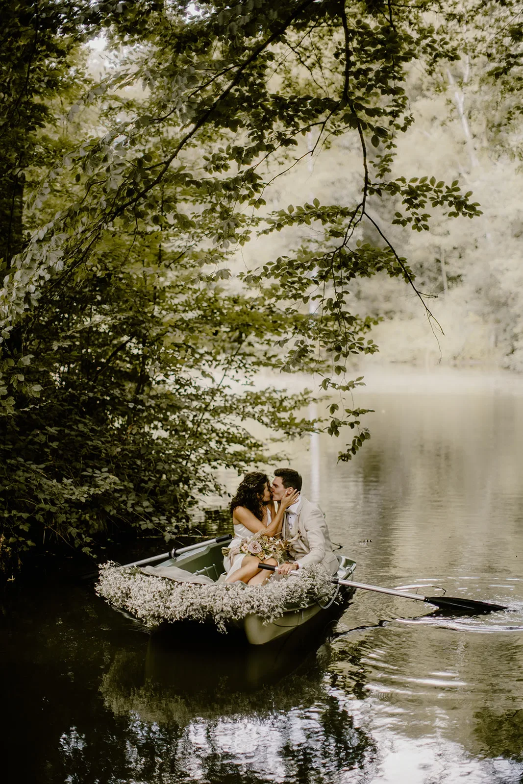 “Eigenlijk vond iedereen het een slecht idee dat we in onze trouwkleding in een bootje zouden stappen. Ze waren vooral bang dat ik met mijn trouwkleed in het water zou vallen. Gelukkig ging alles goed en zijn de beelden prachtig geworden!”