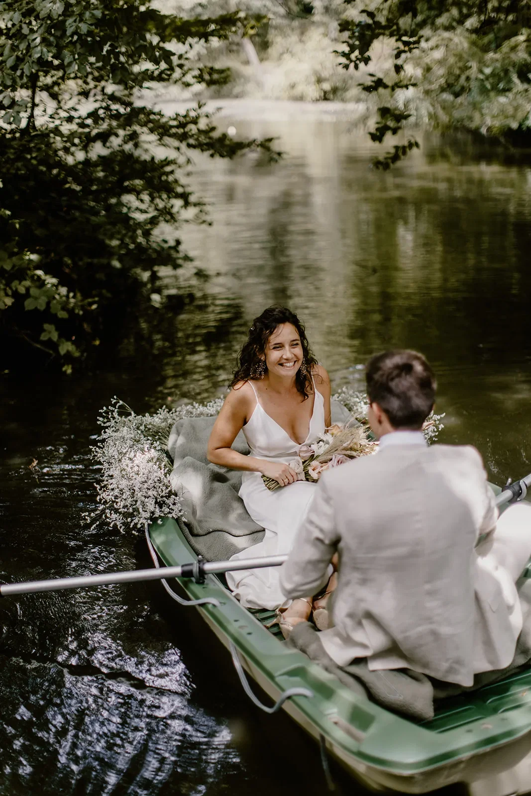 In het café tegenover de kerk werd er met champagne getoost en even tot rust gekomen. Vervolgens reden ze naar het ouderlijk huis van Sebastian voor foto’s. “Zijn ouders wonen bij een bos, waar ook een prachtig meer is. Het leek ons hartstikke tof om foto’s te maken in een bootje. Van een kennis mochten we er eentje lenen en heb ik die de dag voor de bruiloft met bloemen versierd.”
