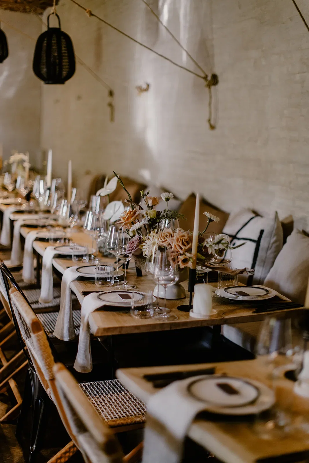 Rikke: “We hadden een kale zaal gehuurd, maar deze was gelukkig prachtig versierd door onze weddingplanners. Voor het diner hadden zij een shared dining-concept in gedachten één van de wedding planners is chef-kok en liet ons van tevoren ook alles proeven. Het was zeer geslaagd en hebben er echt van genoten.”