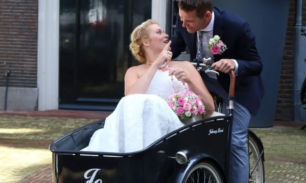 Mirjam: “We zijn allebei Zeeuwen en we komen heel graag in Amsterdam. Na de komst van onze tweeling wilde ik graag trouwen, maar mijn man zag dat niet zo zitten. We besloten om ‘stiekem’ te trouwen tijdens een weekendje Amsterdam en later een etentje te geven voor familie in Zeeland. In eerste instantie wilden we een boot als trouwvervoer, maar dat bleek toch niet zo handig. Ineens dachten we aan onze bakfiets, die we altijd voor de tweeling gebruiken. Die ging achterin onze bus mee naar hotel The Grand, waar we sliepen en dineerden. De portiers keken hun ogen uit toen we de fiets uitlaadden! Jochem heeft me de hele dag rondgereden. Heerlijk!”