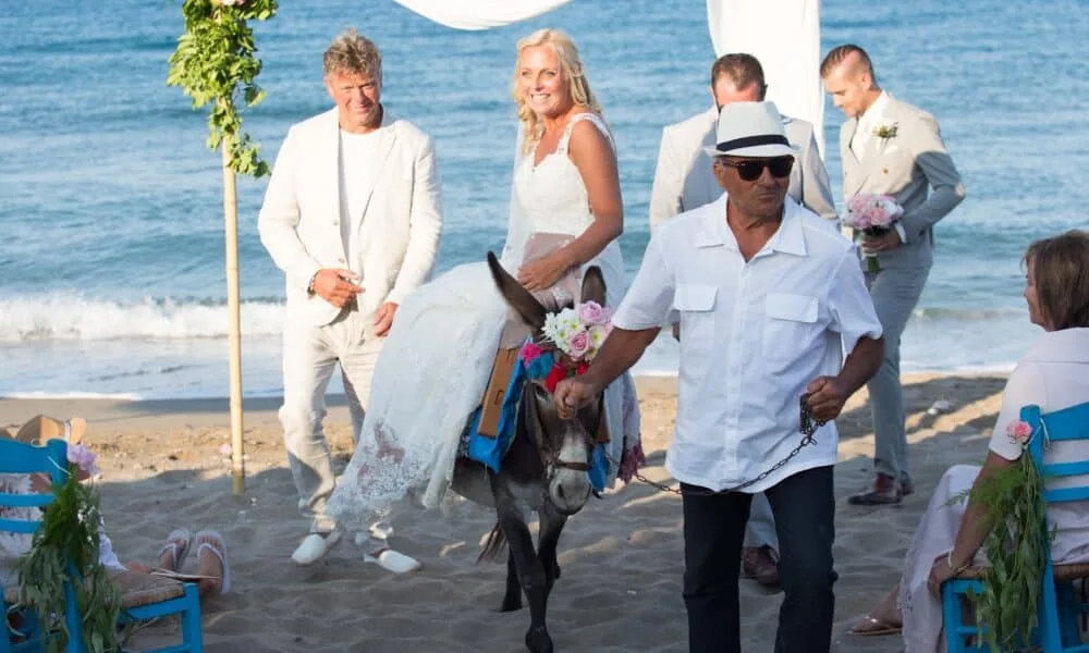 Rowena: “Onze wens was een bruiloft met een klein gezelschap op een zonnig eiland. Lekker zwemmen, cocktails drinken en de liefde vieren! Dat werd het Griekse Karpathos. Op onze trouwdag ben ik met een ezeltje naar de ceremonie locatie gereden. De ezel was door onze stylist en weddingplanner Brigitte van Rijn van De Griekse Bruiloft versierd met prachtige verse bloemen. Toen mijn papa en stiefvader mij voor het eerst zagen, zittend op de ezel, is er wel een traantje weggepinkt! Vergezeld door hen en mijn twee neefjes, die voor me uitliepen, gingen we over het strand naar Edwin. Ik heb een ongelooflijk warm gevoel overgehouden aan dit bijzondere moment!”