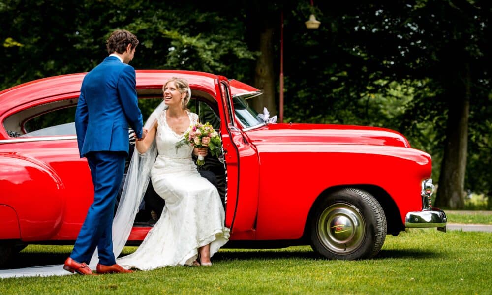 Marleen: “Tijdens een bezoekje aan een strandpaviljoen, onze droomlocatie voor de bruiloft, zagen we een supergave, felrode Chevrolet Fleetline uit 1952 staan. Het kwam ter sprake tijdens de gesprekken die we daar hadden. Toen bleek de oldtimer van de eigenaar van het strandpaviljoen te zijn! Kevin en ik vonden de auto echt prachtig, en we waren dan ook heel blij dat we hem mochten huren voor onze trouwdag. Niemand wist wat voor trouwvervoer wij hadden geregeld, dus toen we aan kwamen rijden tijdens de bruiloft, was dat een leuke verrassing voor iedereen. Het was supergaaf om in deze auto te mogen rijden, en het is een knaller op onze trouwfoto’s!”