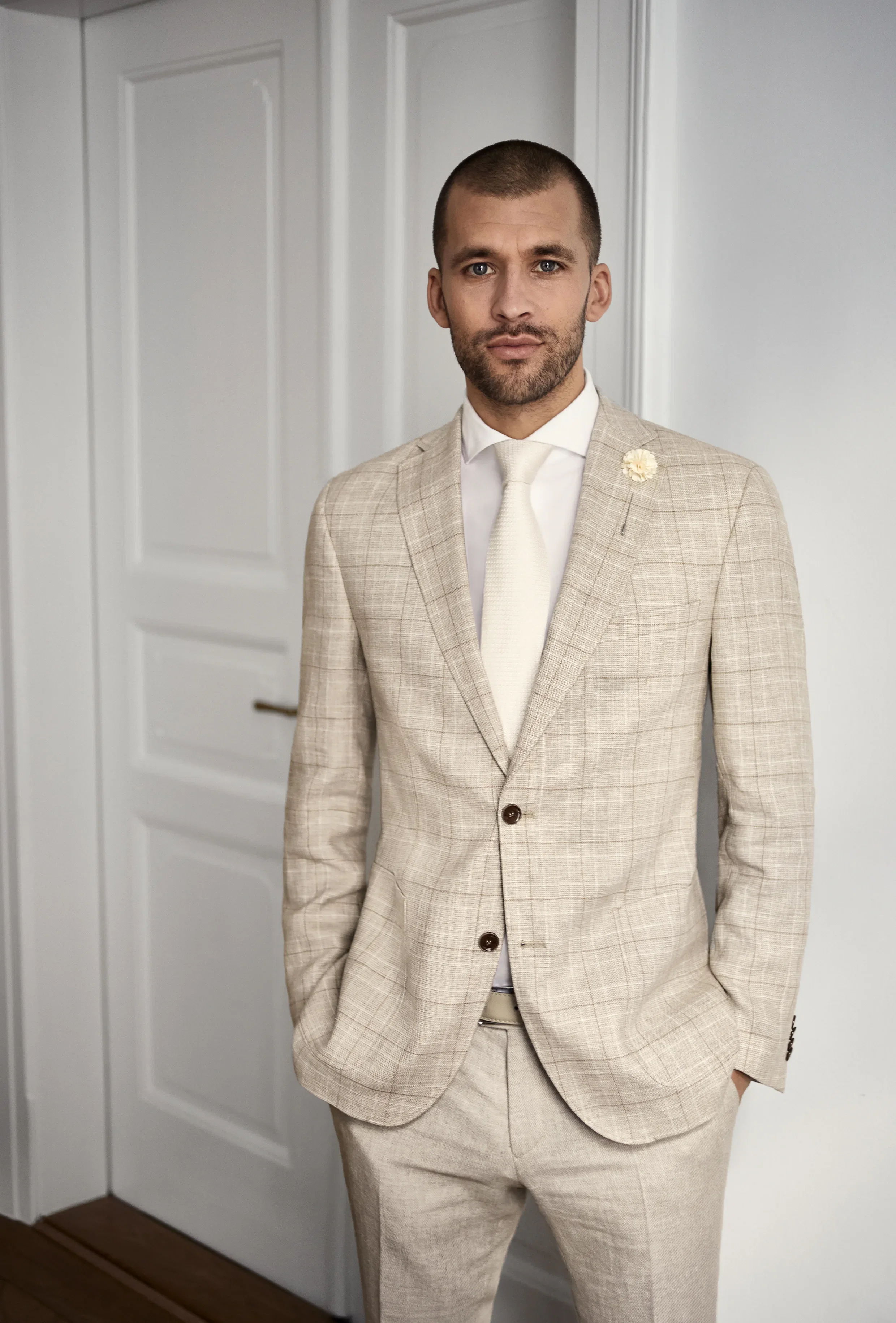 Als bruidegom kun je ervoor kiezen om een donker pak te dragen met een nette stropdas, maar er zijn ook andere opties. Een lichter pak, zoals een lichtgrijs of beige pak, kan ook heel mooi zijn voor een zomerse bruiloft. Een colbert of blazer met een nette pantalon is ook een mogelijkheid, zolang de kleuren en materialen goed bij elkaar passen en het geheel er netjes en stijlvol uitziet.