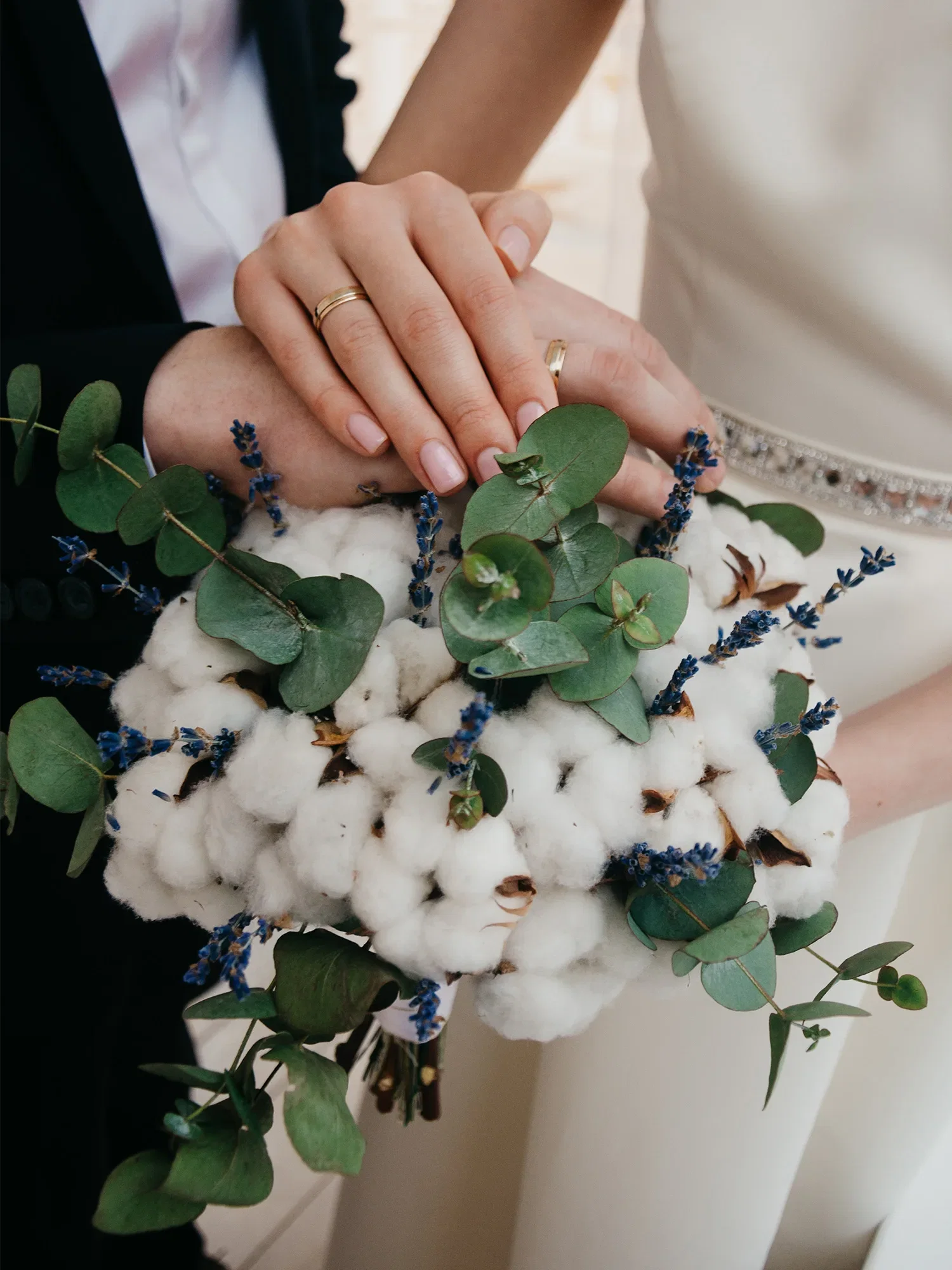 De witte wolkjes van de katoenbollen maken van dit bruidsboeket een luchtige droom! Vul ‘m aan met een paar groene bladeren en eventueel een bloem die terugkomt in je decoratie- of kleurconcept voor een harmonieus geheel.