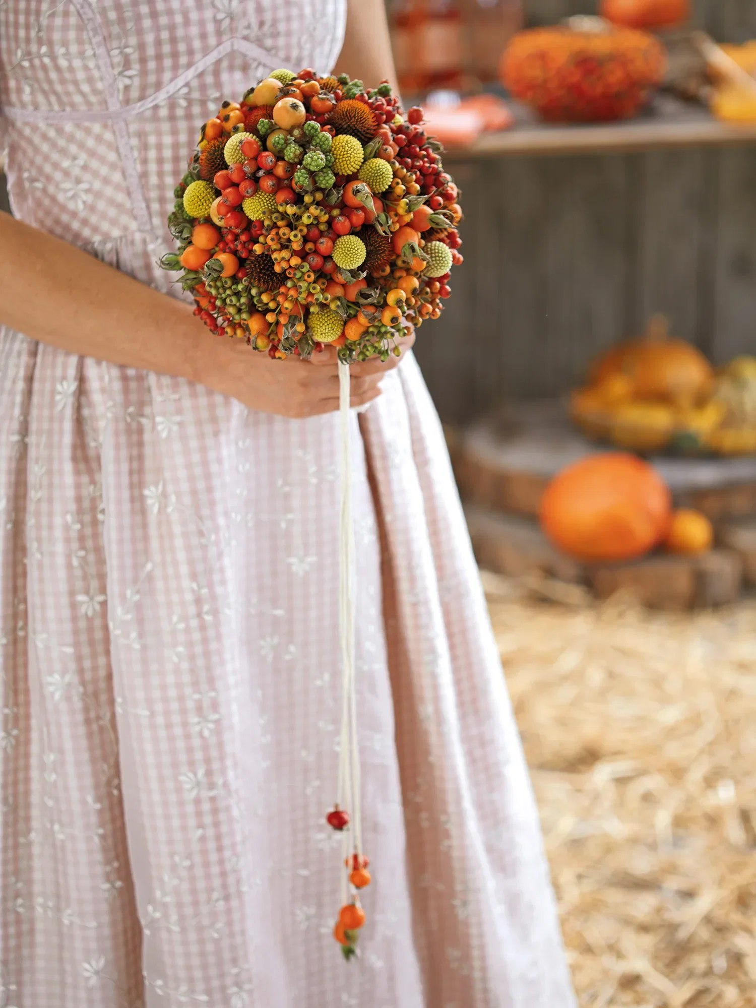 Een lust voor het oog! Uit verschillende fruitsoorten ontstaat een kleurrijk kleurenspel. Het fruit, dat meestal speciaal voor het bruidsboeket wordt gekweekt, geeft je herfsthuwelijk een speels en kleurrijk tintje. Aangezien dit siervruchten zijn, wordt er geen voedsel verspild aan jouw trouwbloemen.