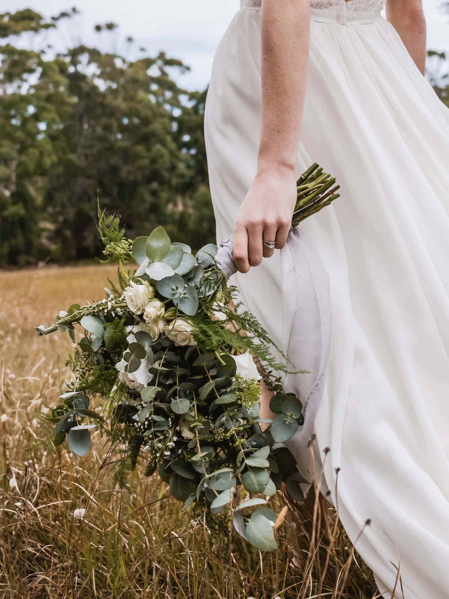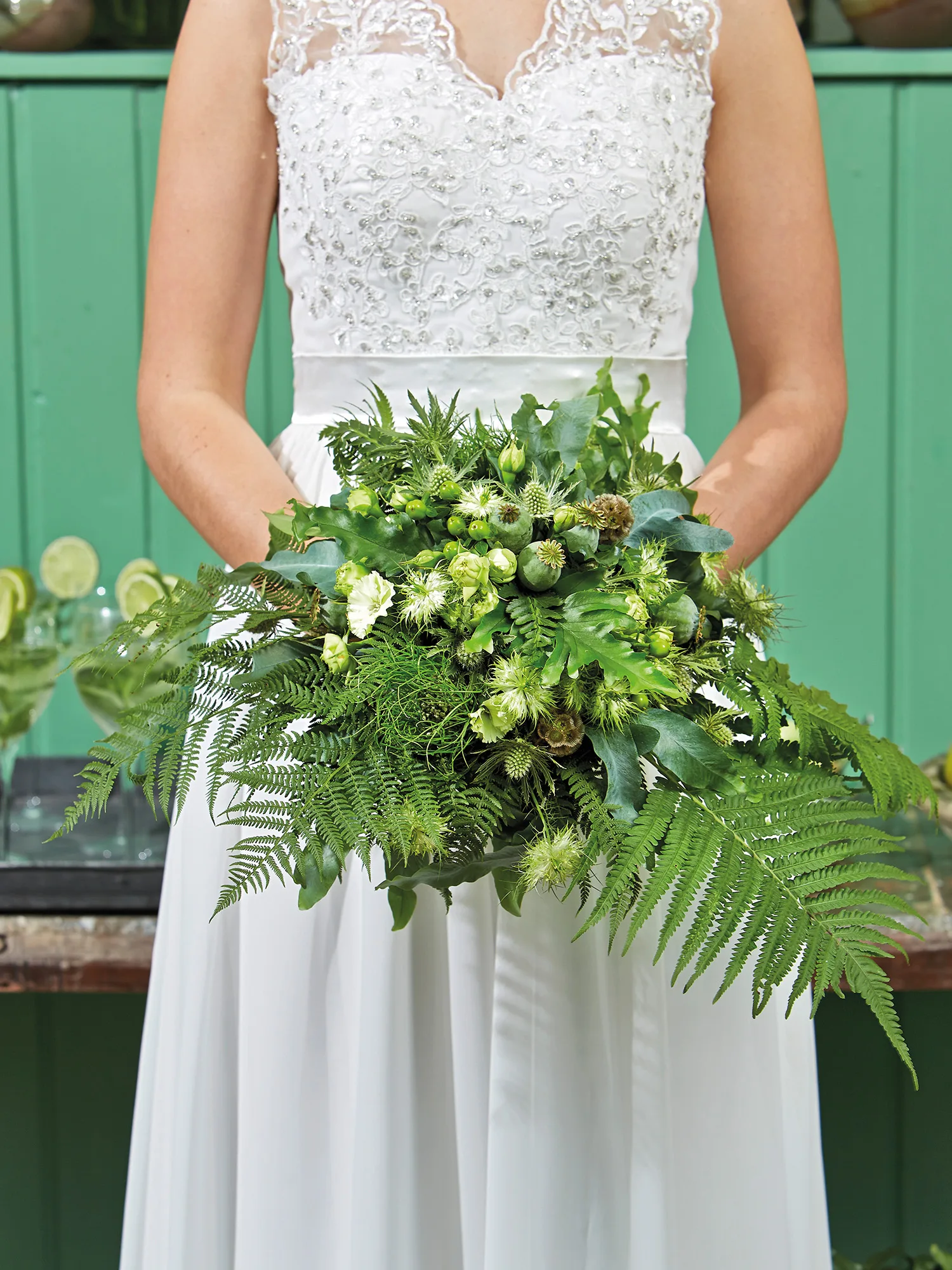Een boeket van groene twijgen zorgt voor het perfecte contrast met een witte trouwjurk. Muntblaadjes, eucalyptus, varenbladeren en weelderig groene Andromeda-ranken toveren een prachtig bruidsboeket tevoorschijn. Perfect voor bos- of buitenbruiloften. Het boeket met greenery-look is ook nog eens zeer duurzaam en uniek. Als je nog op zoek bent naar duurzame confetti, dan kun je ook bosstruiken en planten zoals varens gebruiken.