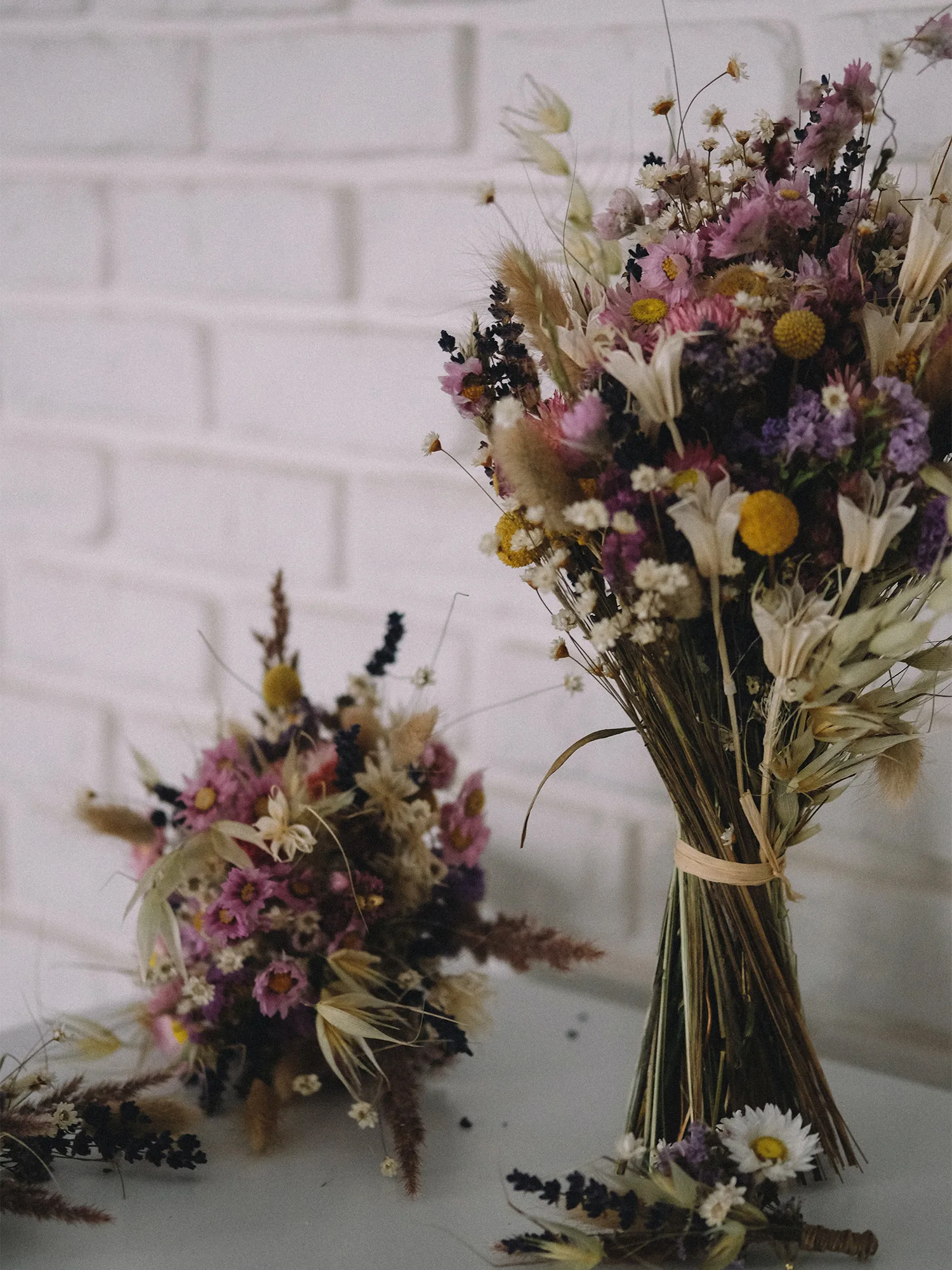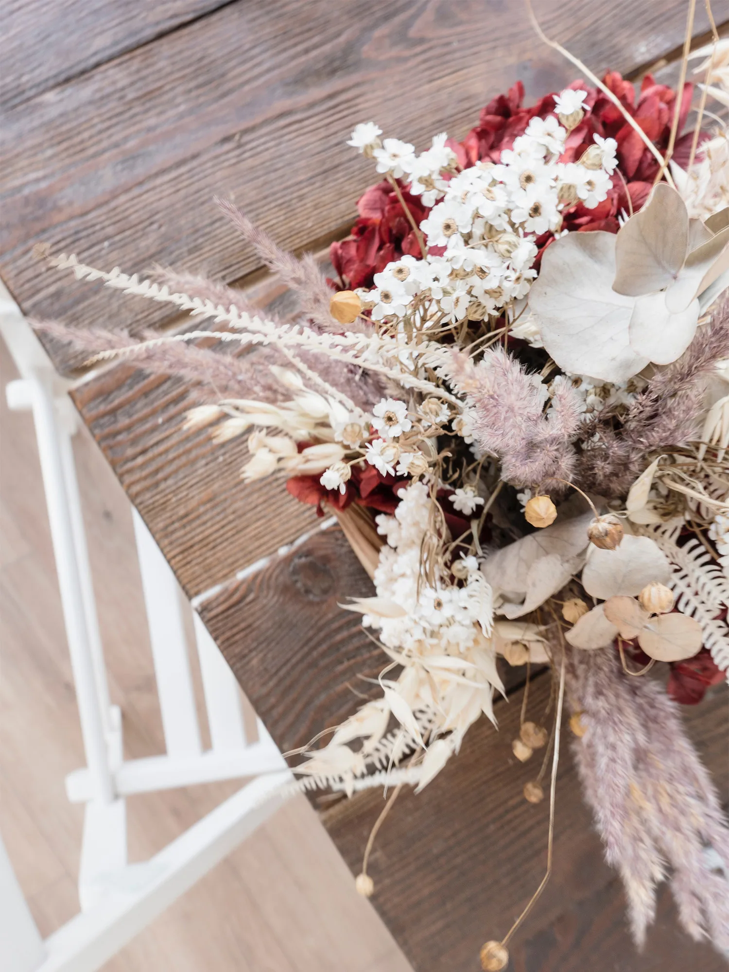 Droogbloemen zijn de perfecte bloemendecoratie voor een bruiloft in boho-stijl. Samen met gedroogde greens en twijgen zijn ze perfect te combineren tot een prachtig bruidsboeket. Een groot voordeel: het boeket droogbloemen zal het pasgetrouwde stel nog jarenlang herinneren aan de mooie dag.