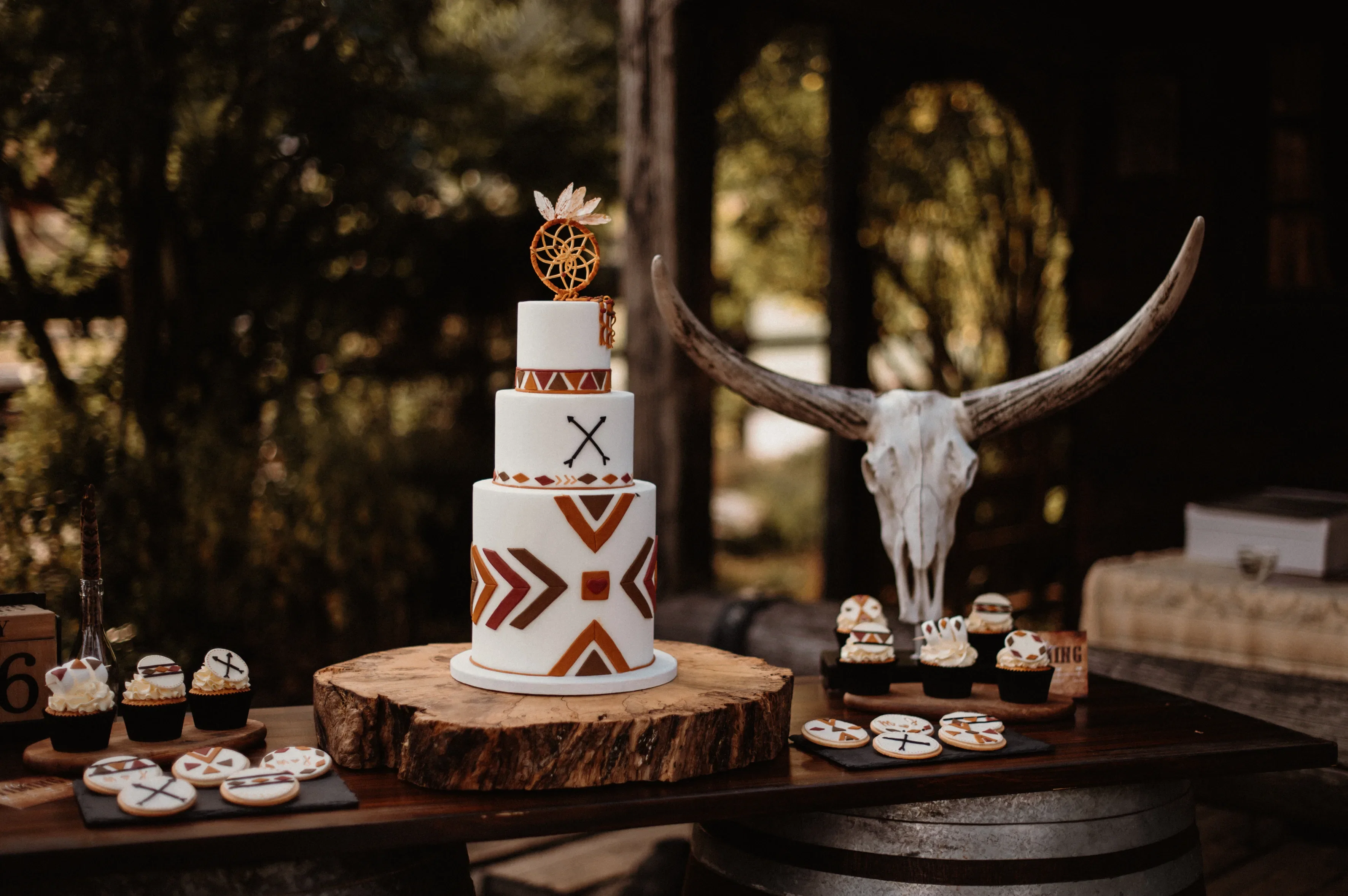 Leg een lange, houten plank over twee oude wijnvaten en voilà: je hebt een rustieke sweet table. De bruidstaart is versierd met passende ornamenten en heeft een kleine dromenvanger bovenop, een absolute blikvanger! Serveer de taart op houten plankjes om helemaal in thema te blijven.
