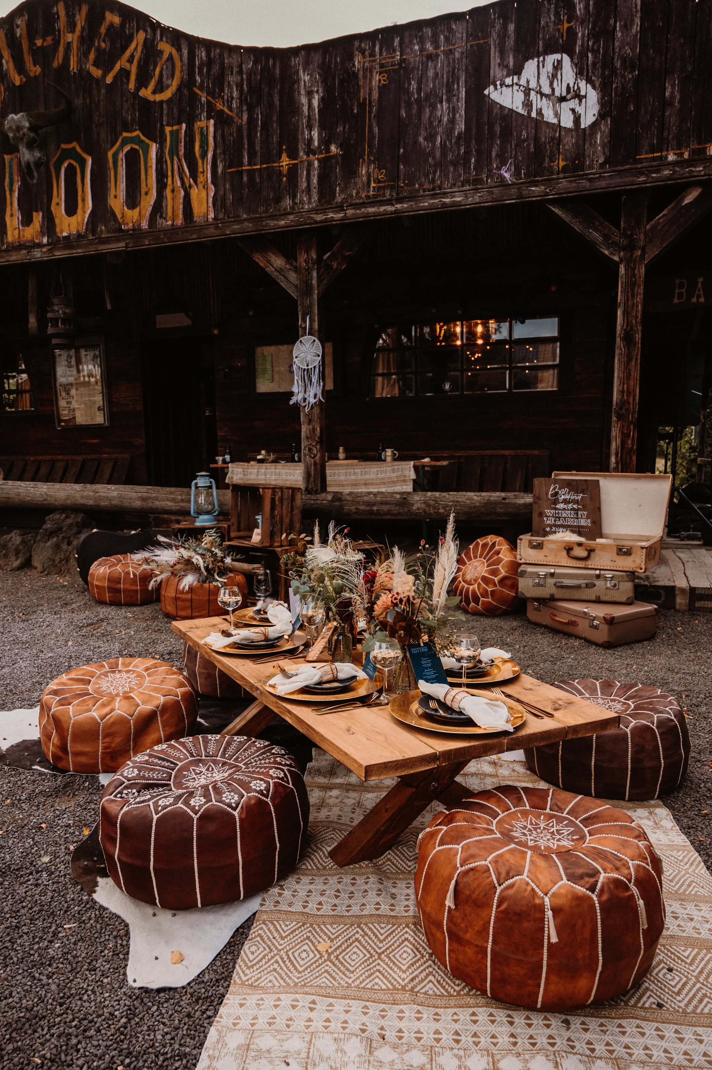 Een lange, houten eettafel met lederen zitkussens of poefen is het ideale uitgangspunt voor een feestelijk diner! Decoreer met westernelementen zoals (nep)dierenhuiden en -leer, hoefijzers en tapijten en geniet van een stevige (vegetarische) barbecue, zelfgemaakte limonade en ambachtelijk bier. Dat wordt smullen!