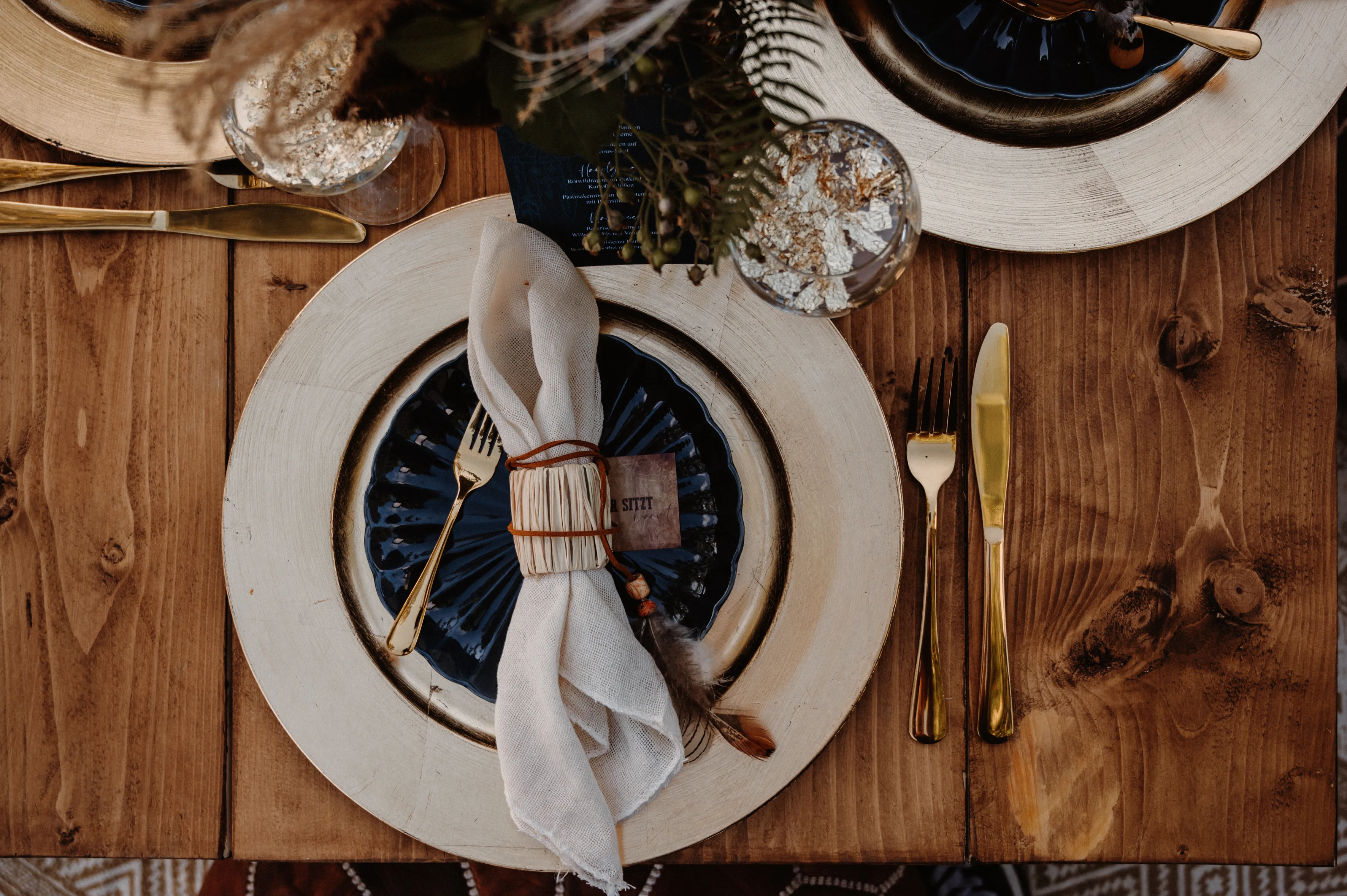 Gedroogde bloemen staan prachtig op tafel en matchen fantastisch met glinsterend goud en zwoele, donkeren tinten, zoals hier met goudkleurig bestek bij petrolkleurige borden en witte, stoffen servetten.
