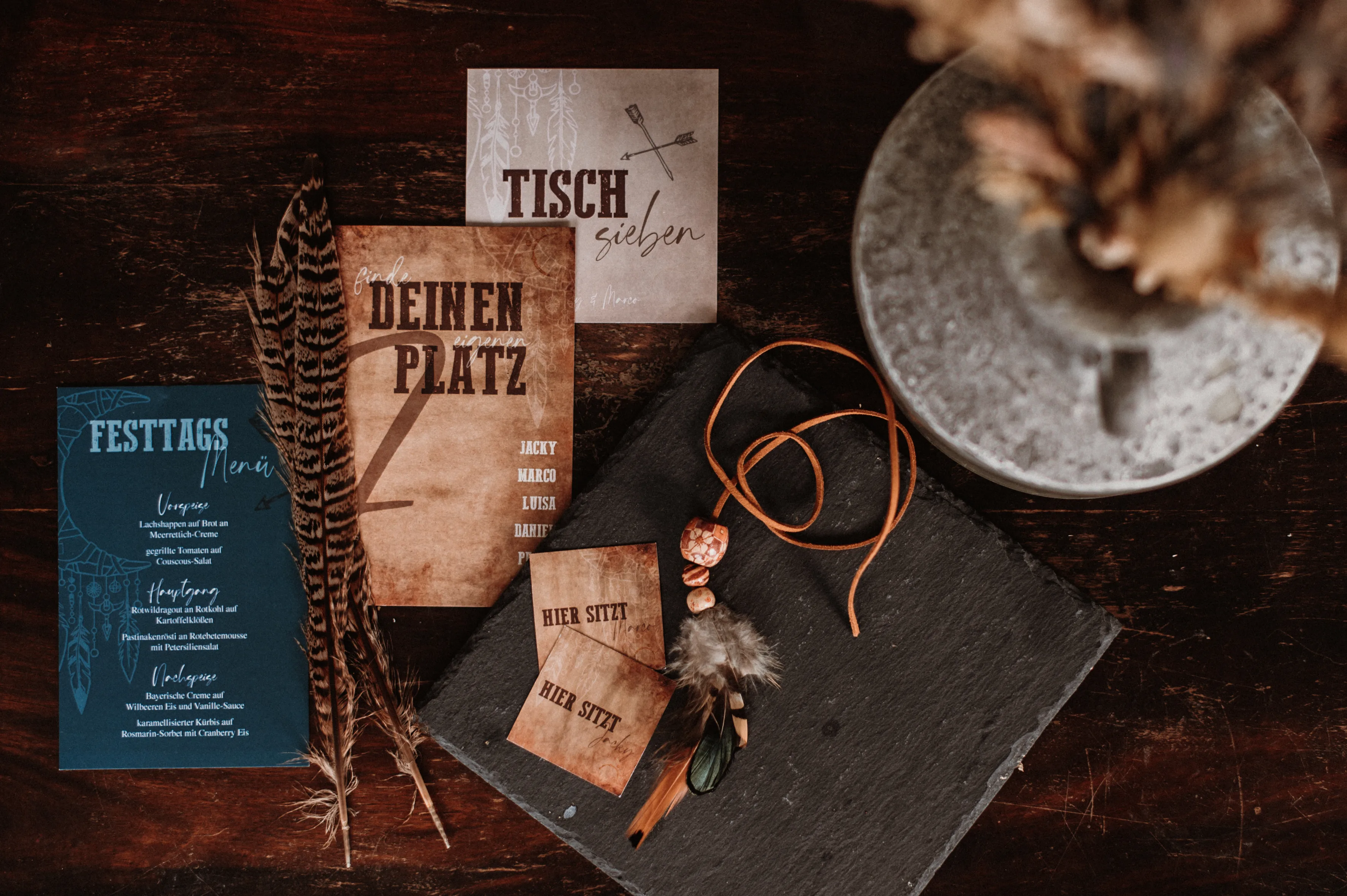 Briefpapier in de look van oude wild west-posters zijn geweldige blikvangers. Het menu en de naamkaartjes zijn uitgevoerd in donkere tinten die hier mooi bij passen. Veren en accessoires in matching stijl complementeren de rustieke uitstraling.