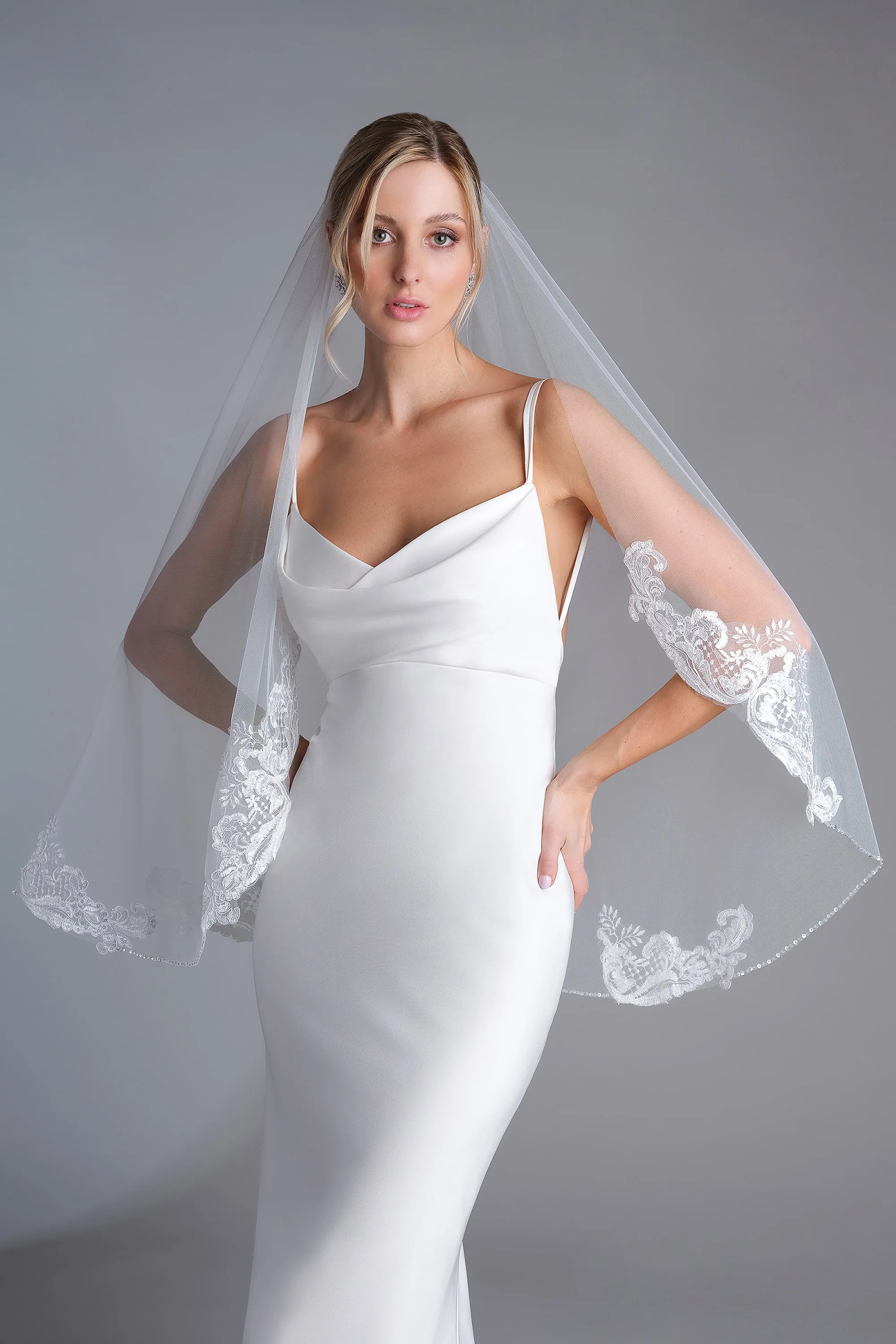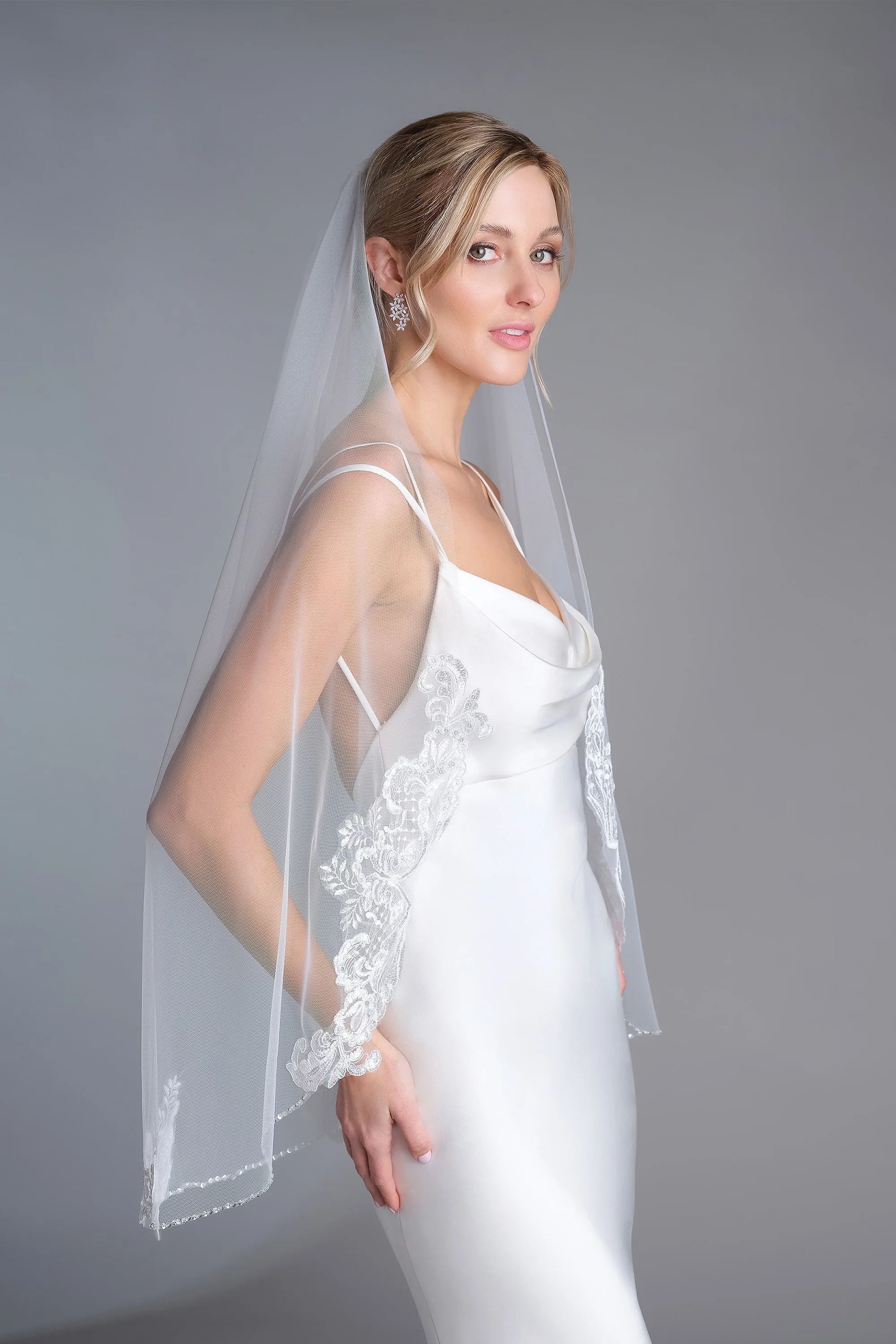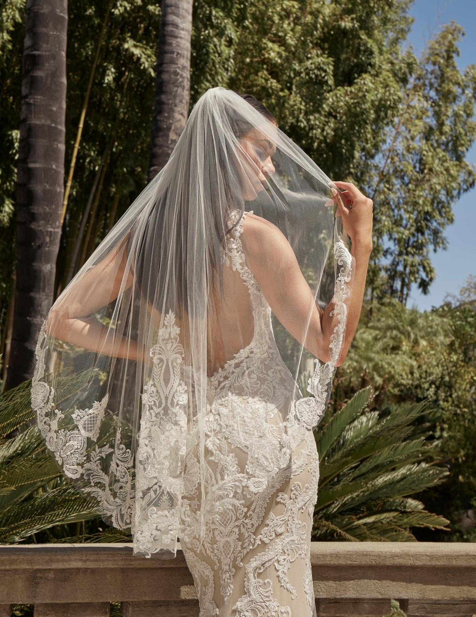 De vingertopsluier reikt tot ongeveer de vingertoppen en past goed bij bijna elk type trouwkleed.